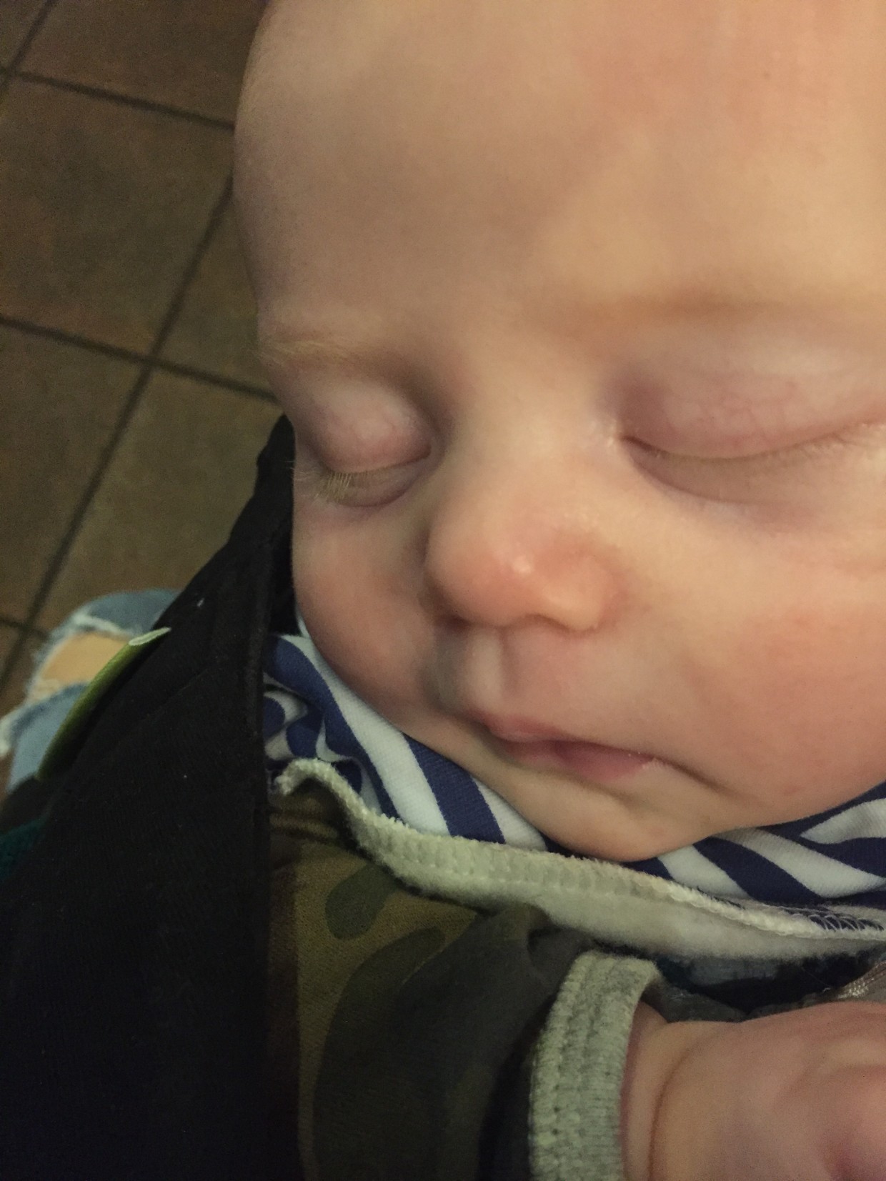 mom may be here for coffee, but i’m comfy and sleeping in my carrier