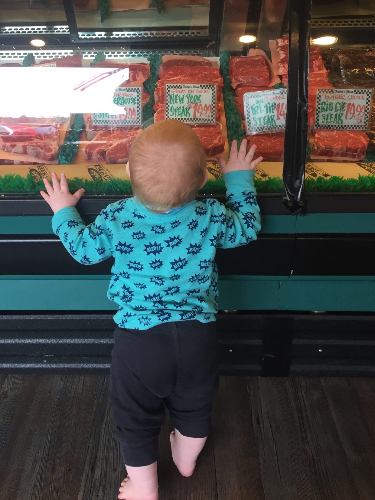 That steak looks so good that it makes me want to come right up and eat some with you! Your teeth are coming in fast, so you will be chewing the meat really soon!