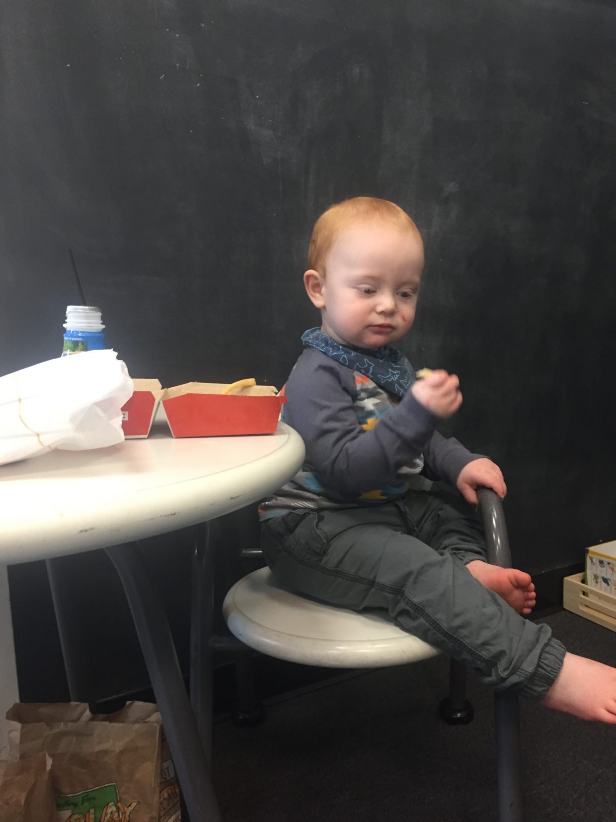 There is a well used table & chairs just his size in Lanikai. He can practice on them one day soon. With sweet potato fries!!!