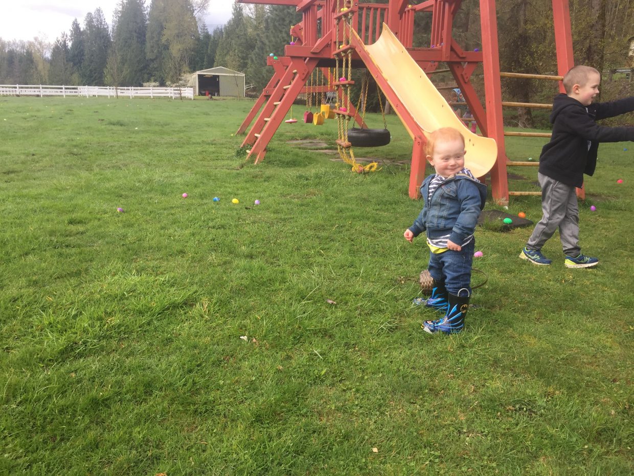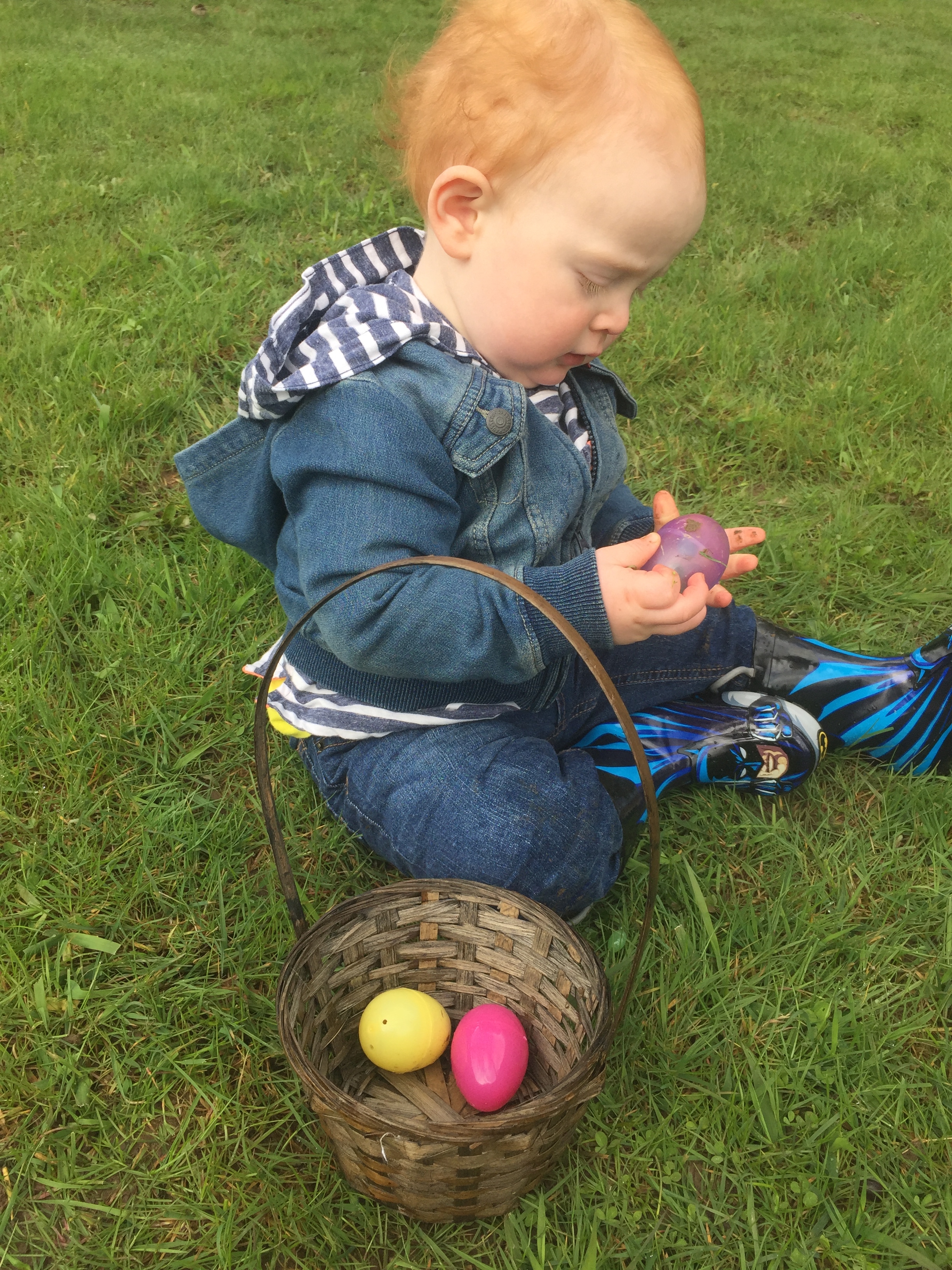 The FIRST Easter Egg Hunt for Finn………… and I’m told it is the LAST one for Kaitlynn! I bet the Batman boots helped you find them!!