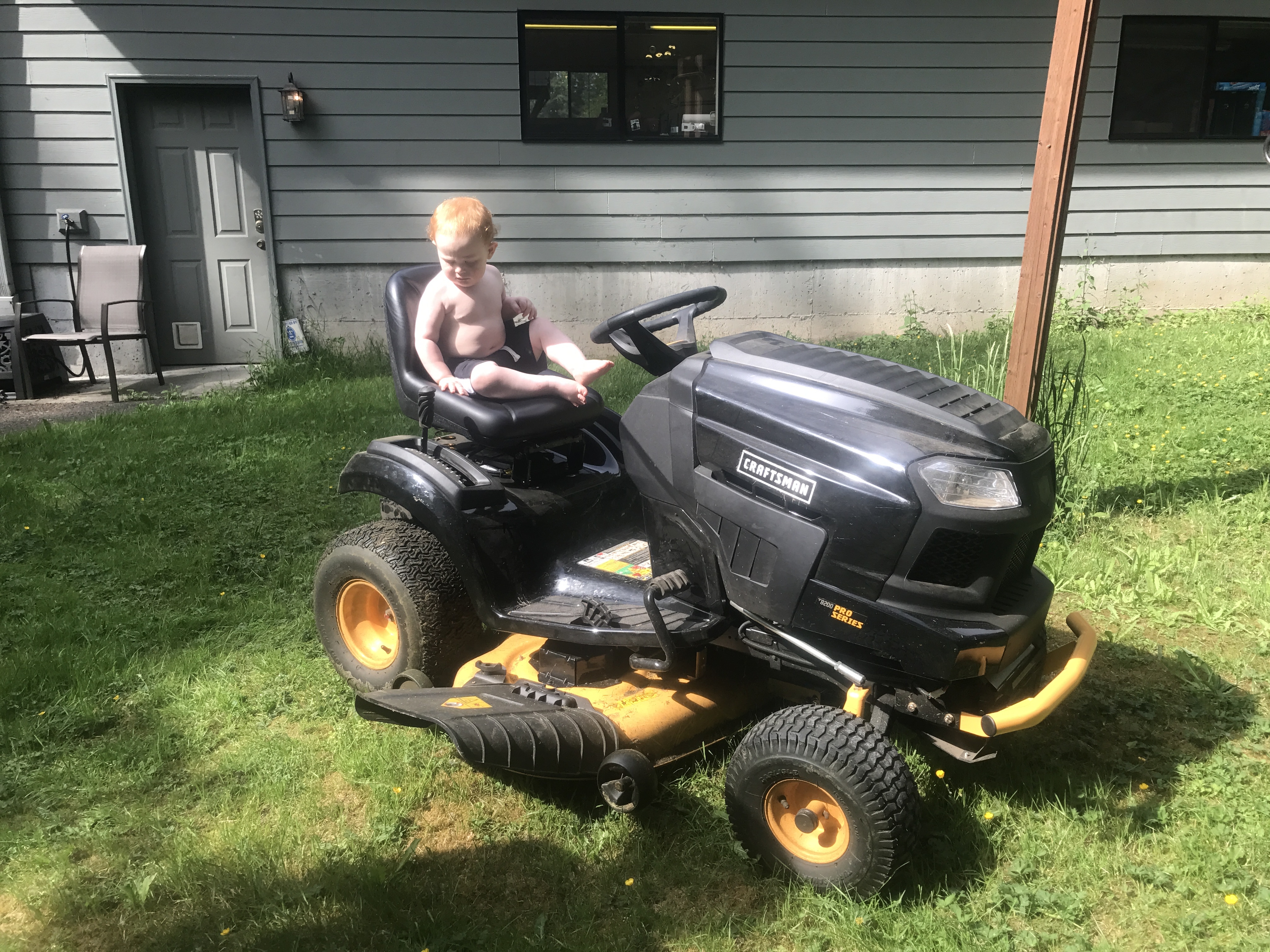 Look at Finn about to start the mowing the lawn for Daddy! Just be sure not to head the mower down toward the lake!! It doesn’t swim at all!