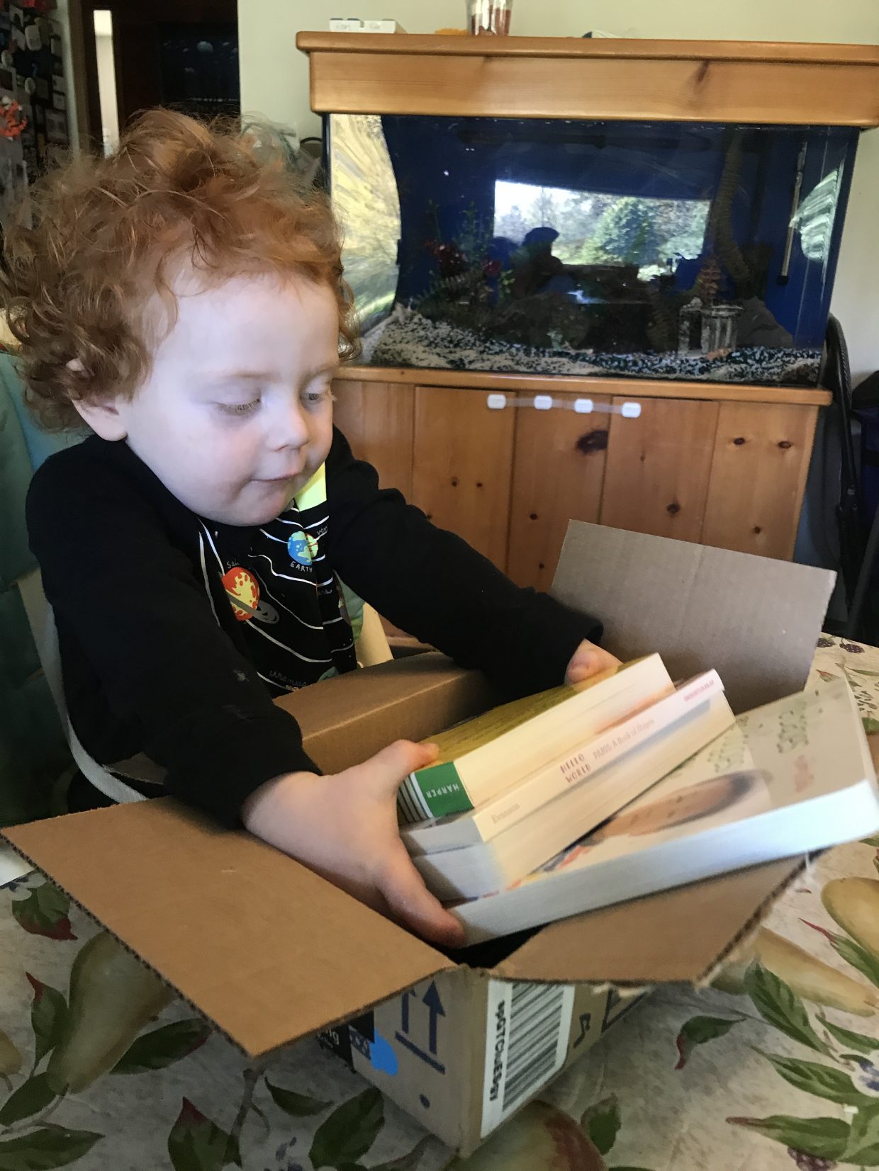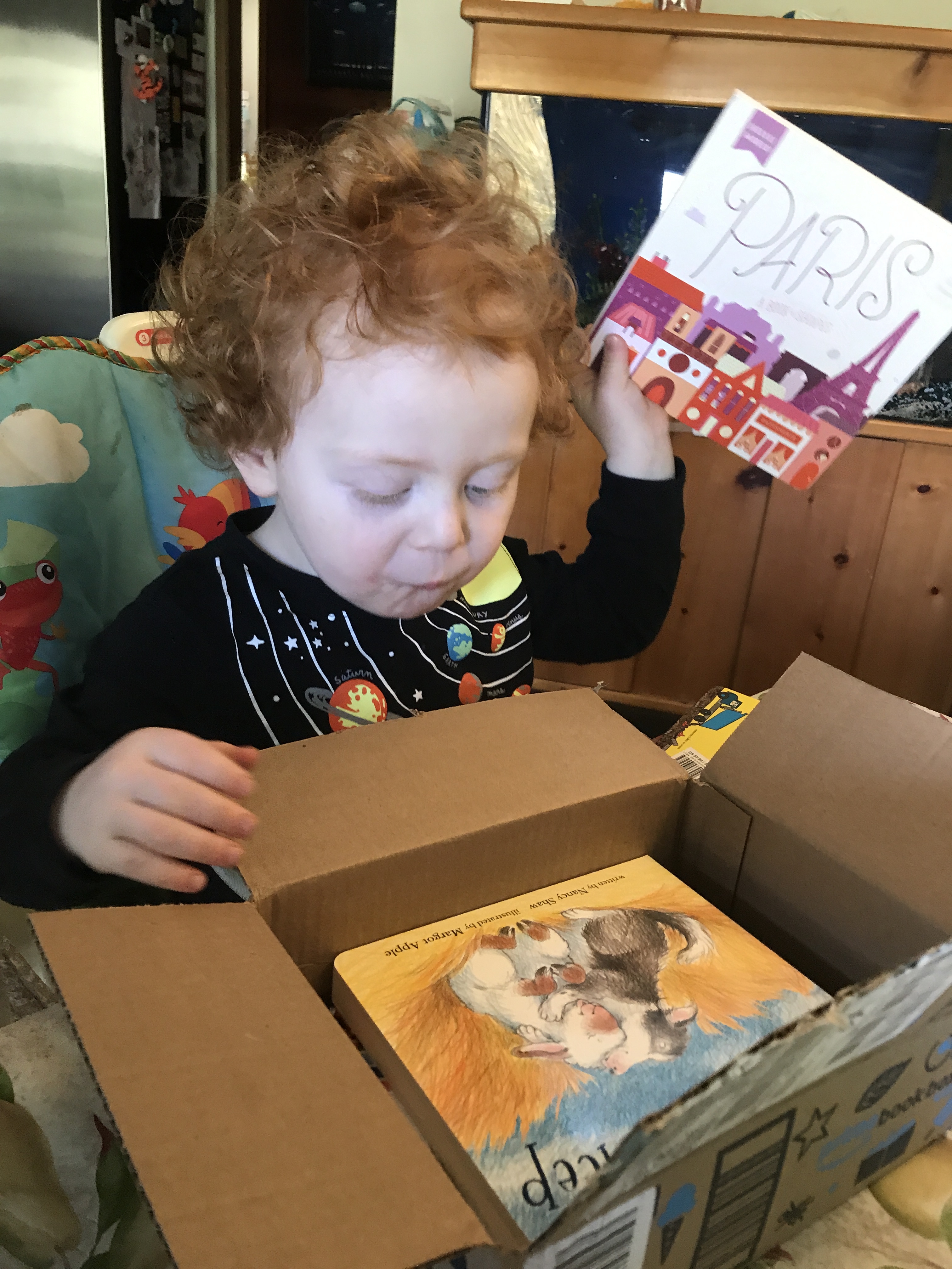 for a minute there, I thought you had decided to skip chapter books altogether and just jump into adult books!! But I see there is at least one little guy book in that box….. read away!!!