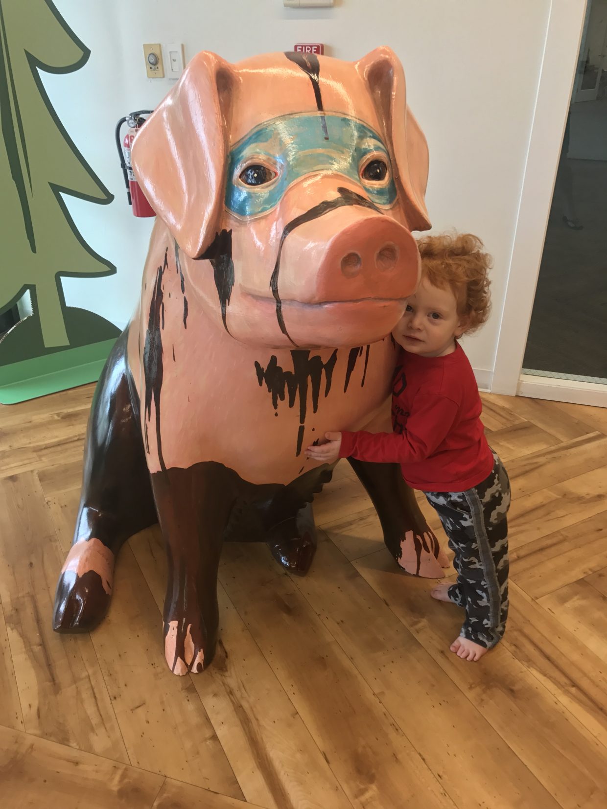 What a really big pig! And he looks like he is wearing a blue mask, almost like he is getting dressed up for Halloween with the blue mask and the brown paint dripping down his body! Or maybe he ran through the brown mud? 🙂