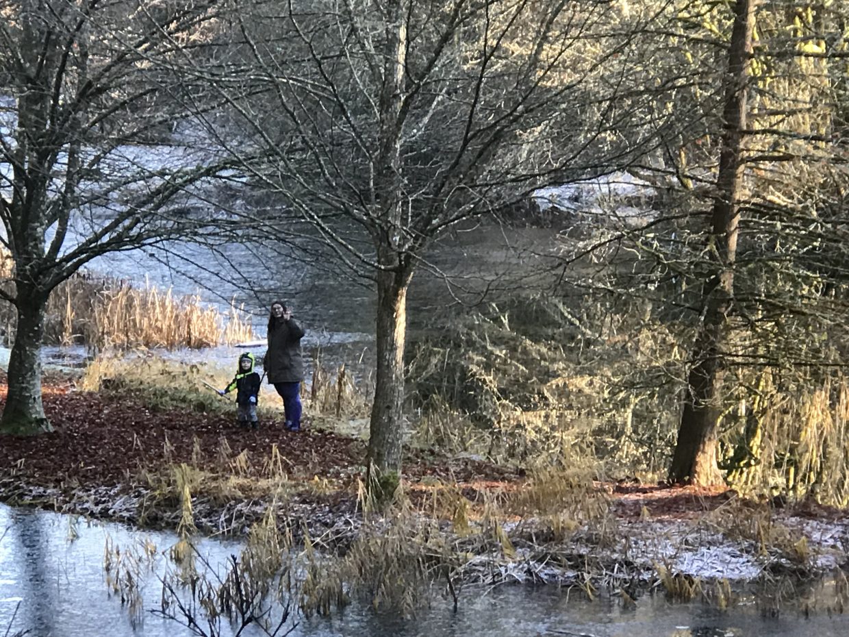 The lake is frozen! Me and Auntie Hannah found some rocks to throw on the ice!