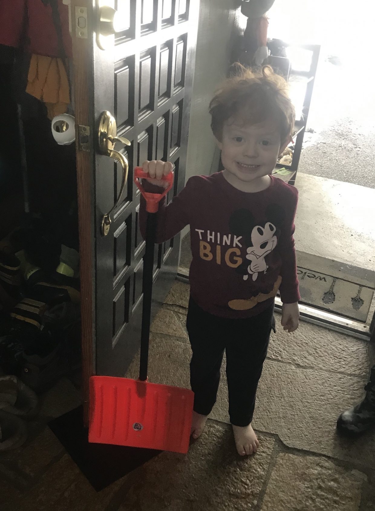well, your mother might not have noticed, but you have not put your boots on yet!! When you do, THAT would be the time to go shovel, I would think. I do love the shovel…. it is just your size!