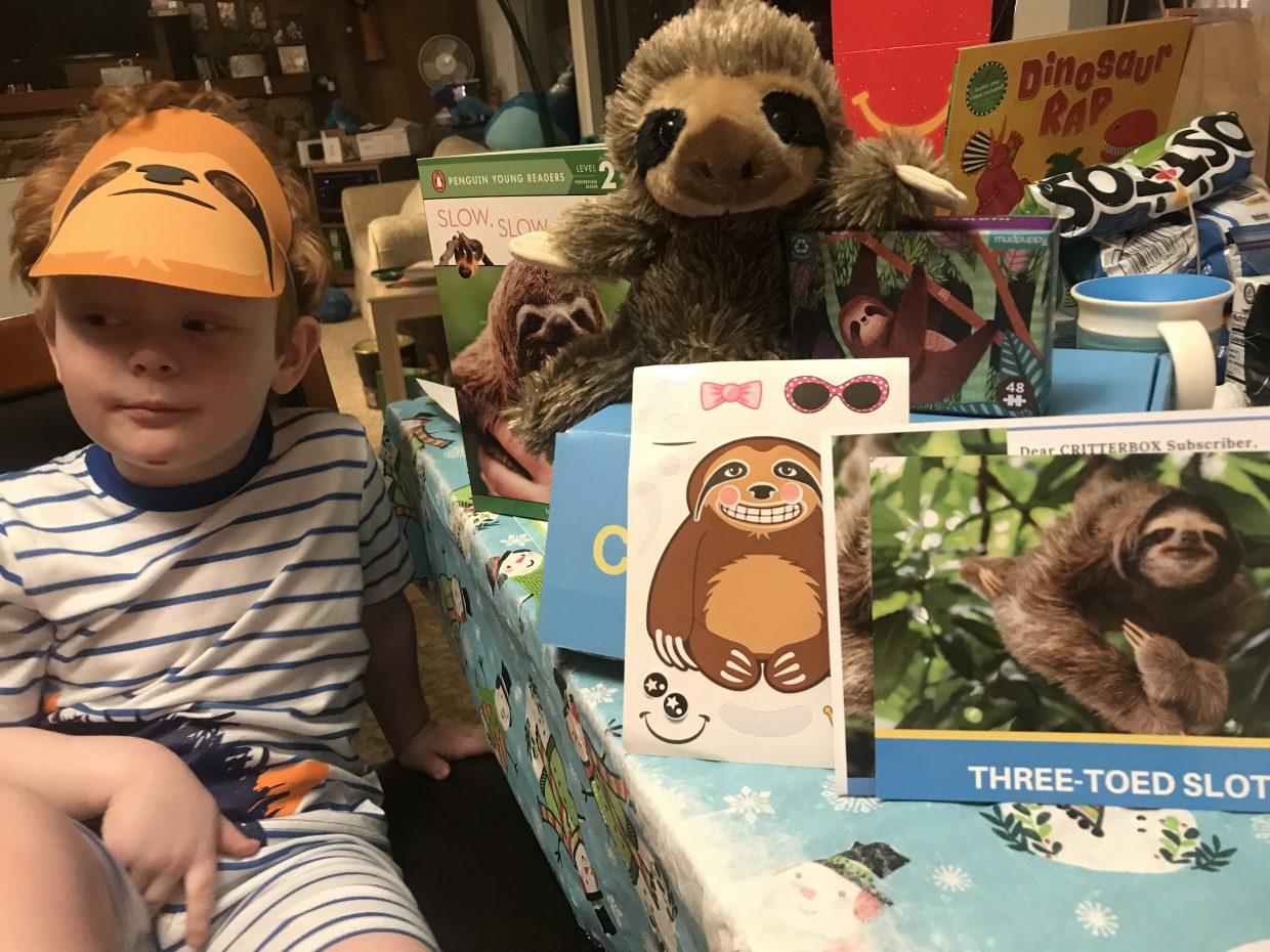 I learned that sloths are super super slow! They live in trees in the rainforest and hang upside down with their long arms. And they only leave their trees to go potty or to swim!