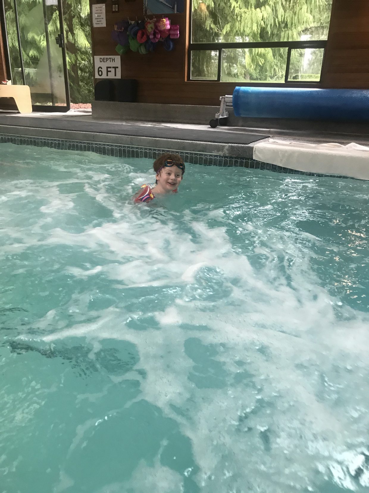 Mom says I have to tell you that 2 weeks ago I wouldn’t even get off the steps, but today I paddled all the way across the pool AND floated down the bubble stream!