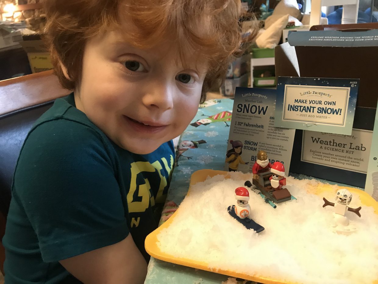 We learned about, and played with, snow – inside! Snow is that really cold stuff that falls from the sky when it’s too cold for just rain. If it’s icy instead of soft flakes, that’s called hail. We had a bunch of hail storms this week! But no snow, except the fake kind. ❄️