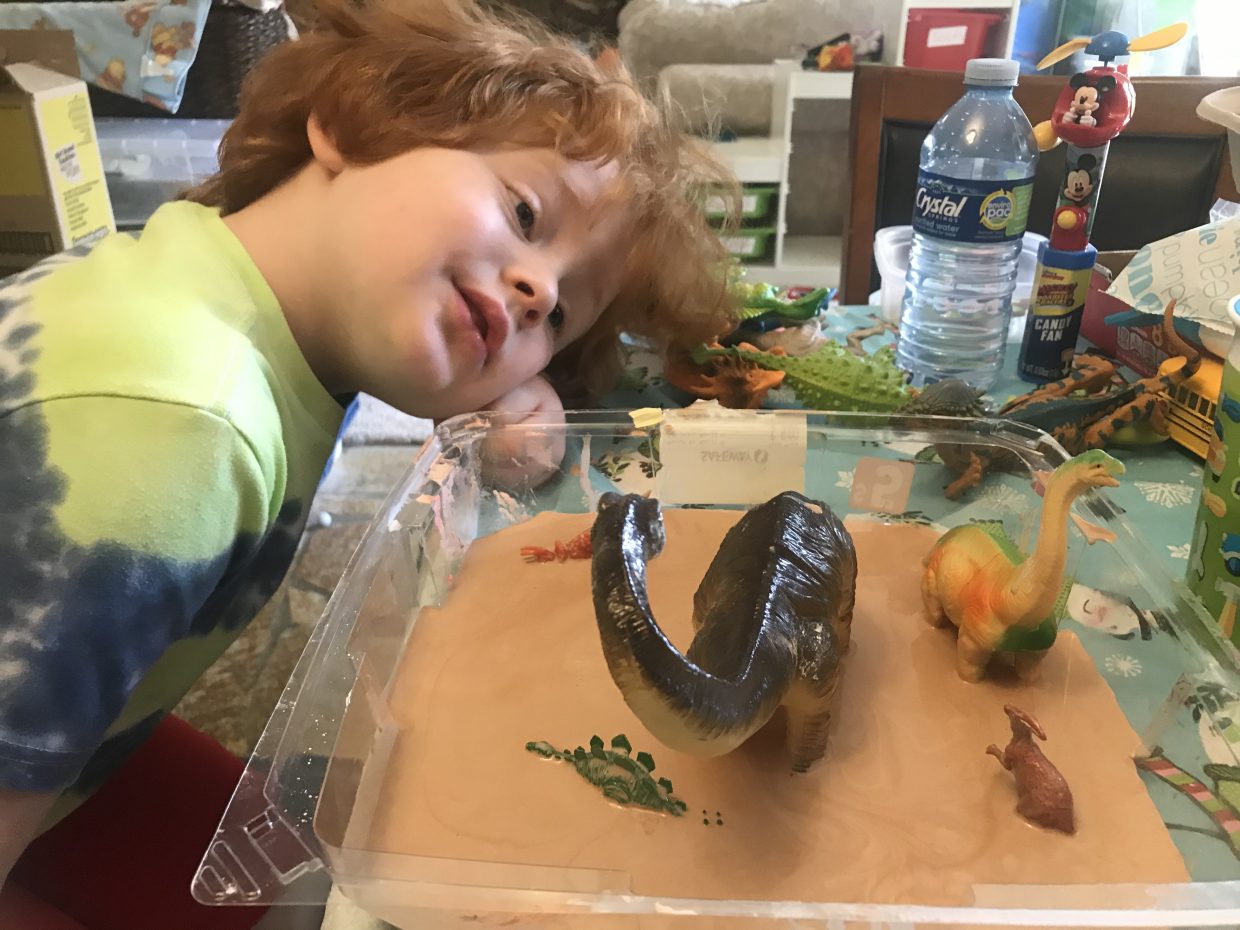 Actually, my Mom says it’s a “non-Newtonian fluid” called “oobleck.” It’s really neat. Sometimes it’s like a liquid and sometimes like a solid. If the dinosaurs try to run really fast across it, they can. But if they go slow, then they sink and get stuck!