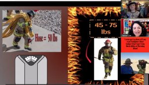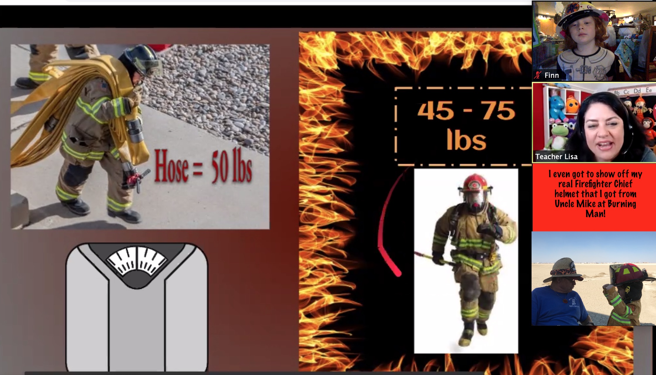 In today’s class we learned about what kinds of things that fire fighters do and how heavy the stuff they wear is. Did you know that they wear around 100 pounds of gear, if not more??? That’s almost 2 of me! Of course, I already knew most of it because of all of my friends from Burning Man who are fire fighters! I even got to show off my official Fire Chief Helmet that Uncle Mike gave me!