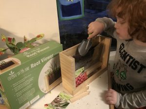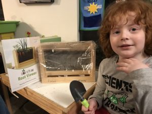 This fun contraption is called a “root viewer” because we’ll be able to see inside the planter box and see the roots of the veggies we planted: radishes, carrots, and green onions. When they get big, we will even be able to eat them!