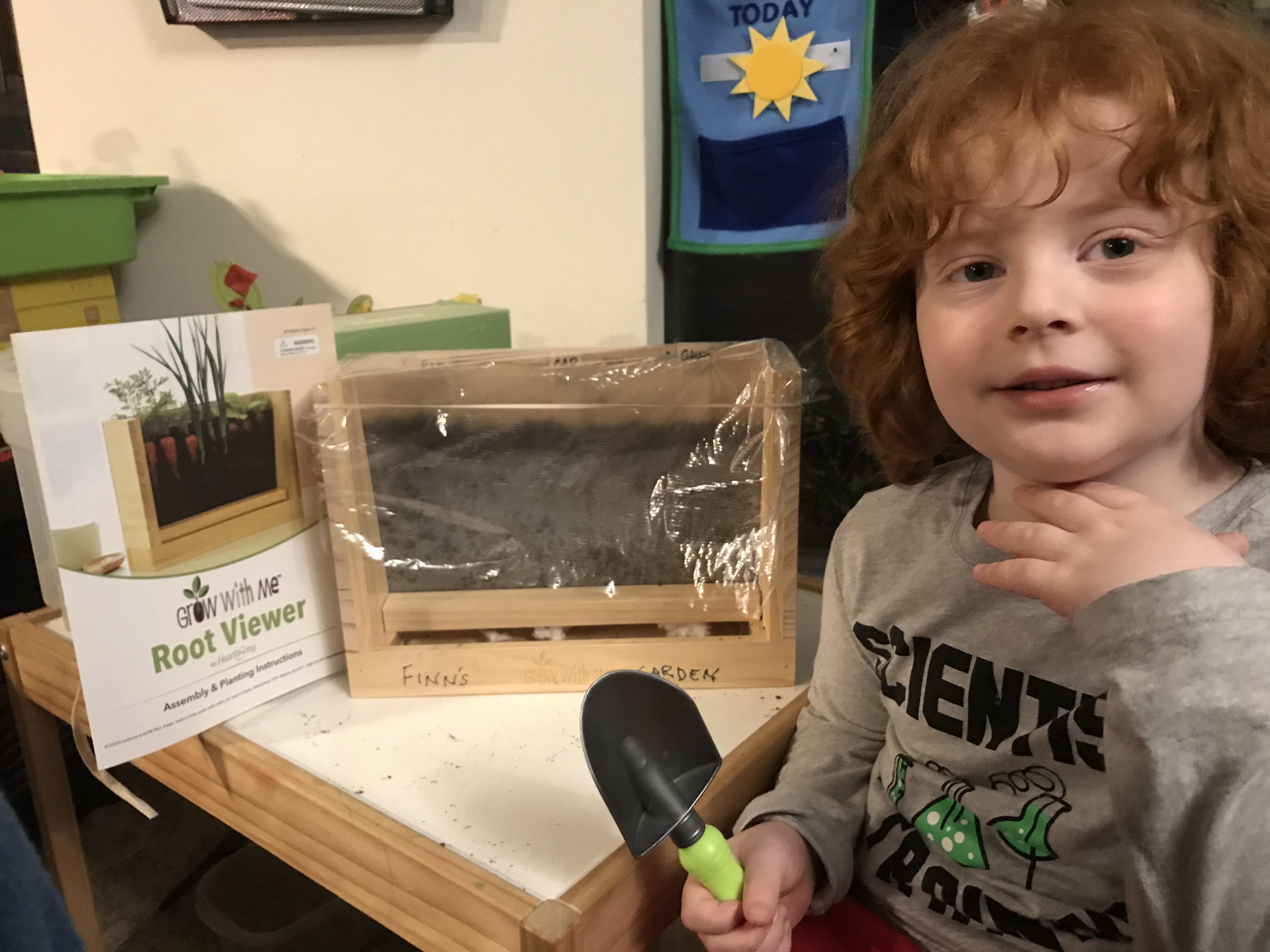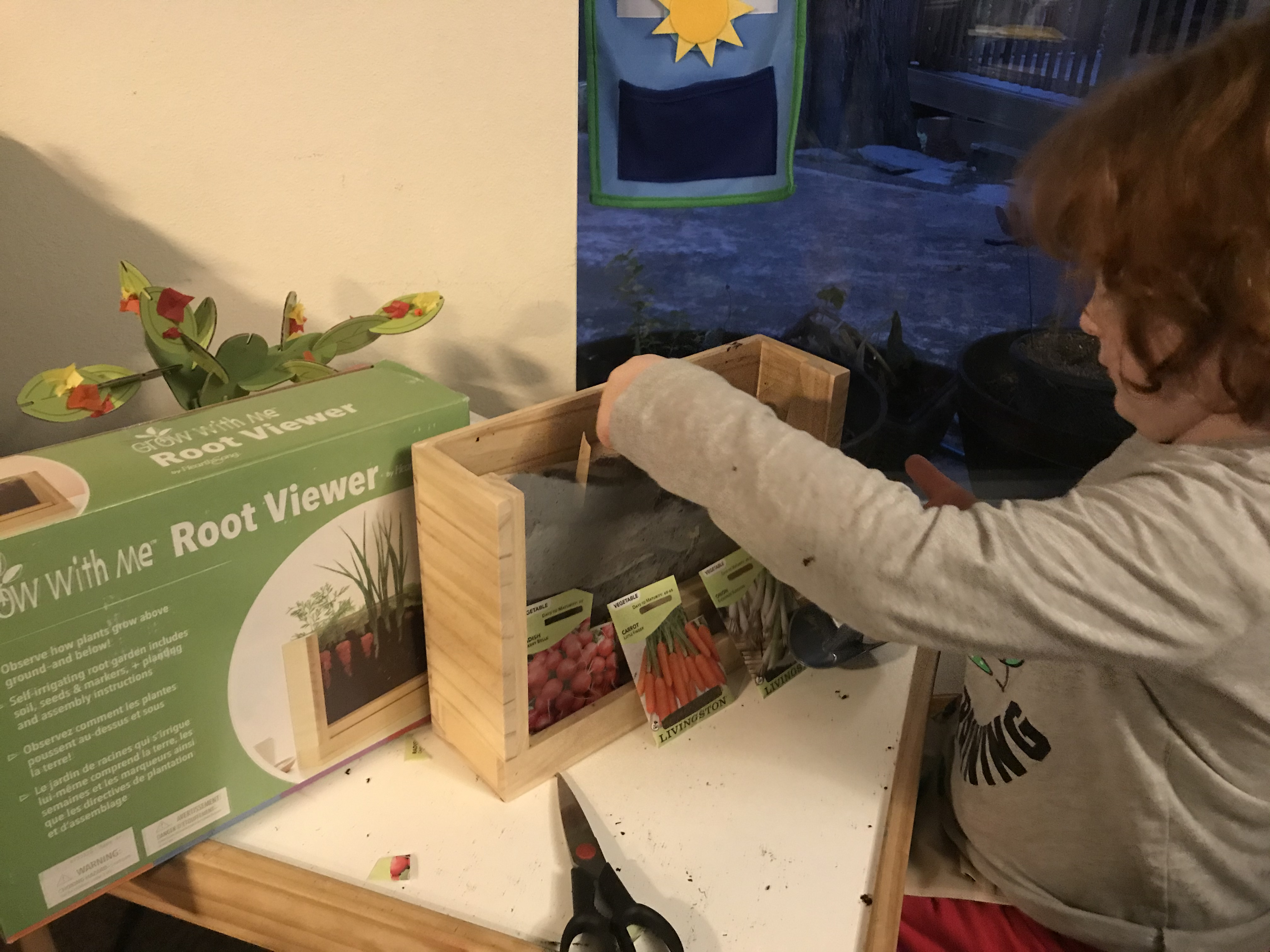 This fun contraption is called a “root viewer” because we’ll be able to see inside the planter box and see the roots of the veggies we planted: radishes, carrots, and green onions. When they get big, we will even be able to eat them!