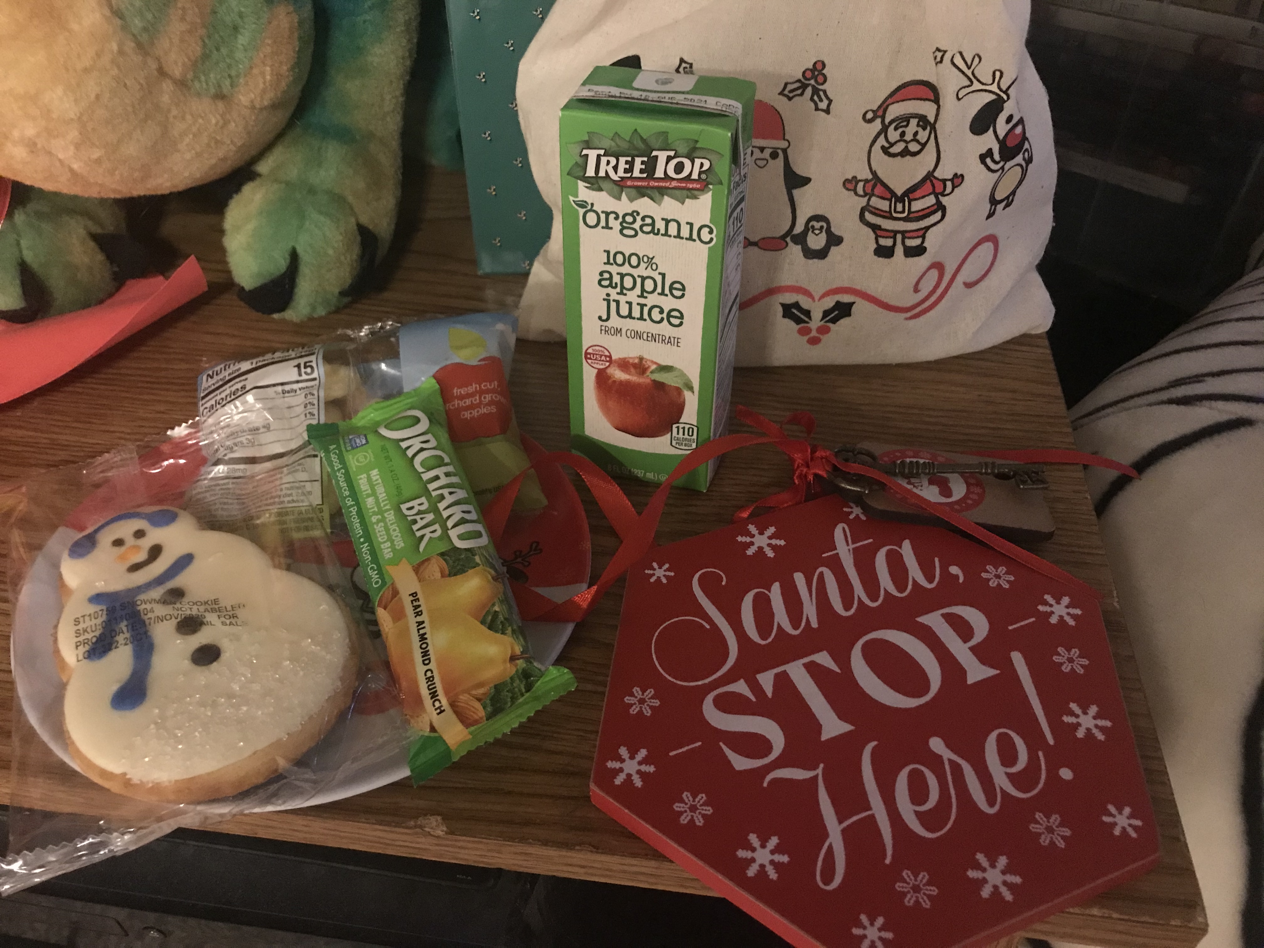 I made sure to leave out some juice and cookies for Santa (and some apples for the reindeer!), but I put them in a “to go” bag because it’s not safe for indoor dining.