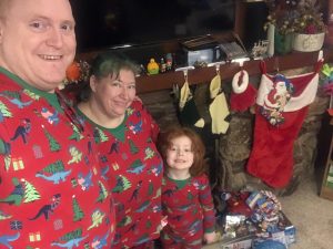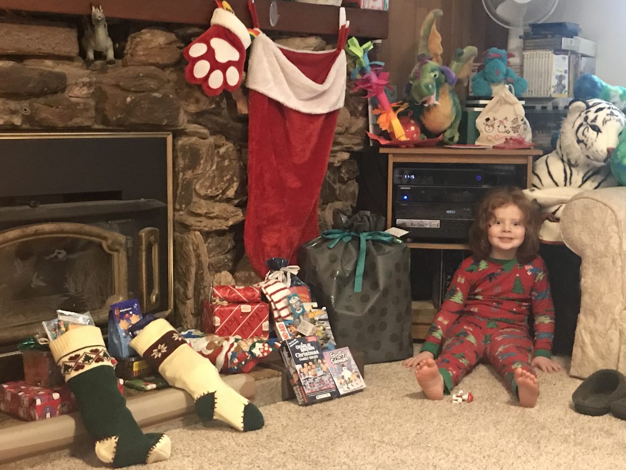 It looks a little like they just took YOU out of the gigantic stocking hanging on the Mantle!!! Actually, I remember your very first Christmas, we were there too and you WERE inside that stocking for a few minutes. D-Dad did NOT let you slip down into it! You would think it funnier this year than you did then!! (I think!) 😉