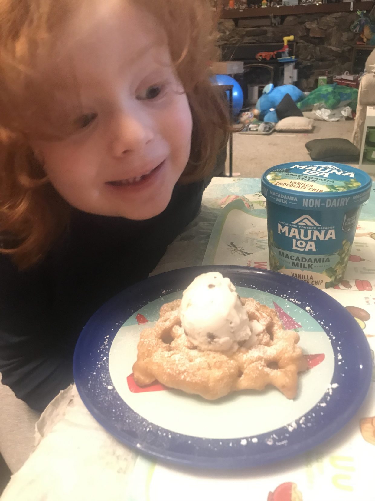 Macadamia nut ice cream is good ANY time of day!!! And what is under it looks pretty delicious also!! I would guess an apple fritter if it were on my table. But, maybe not on yours……