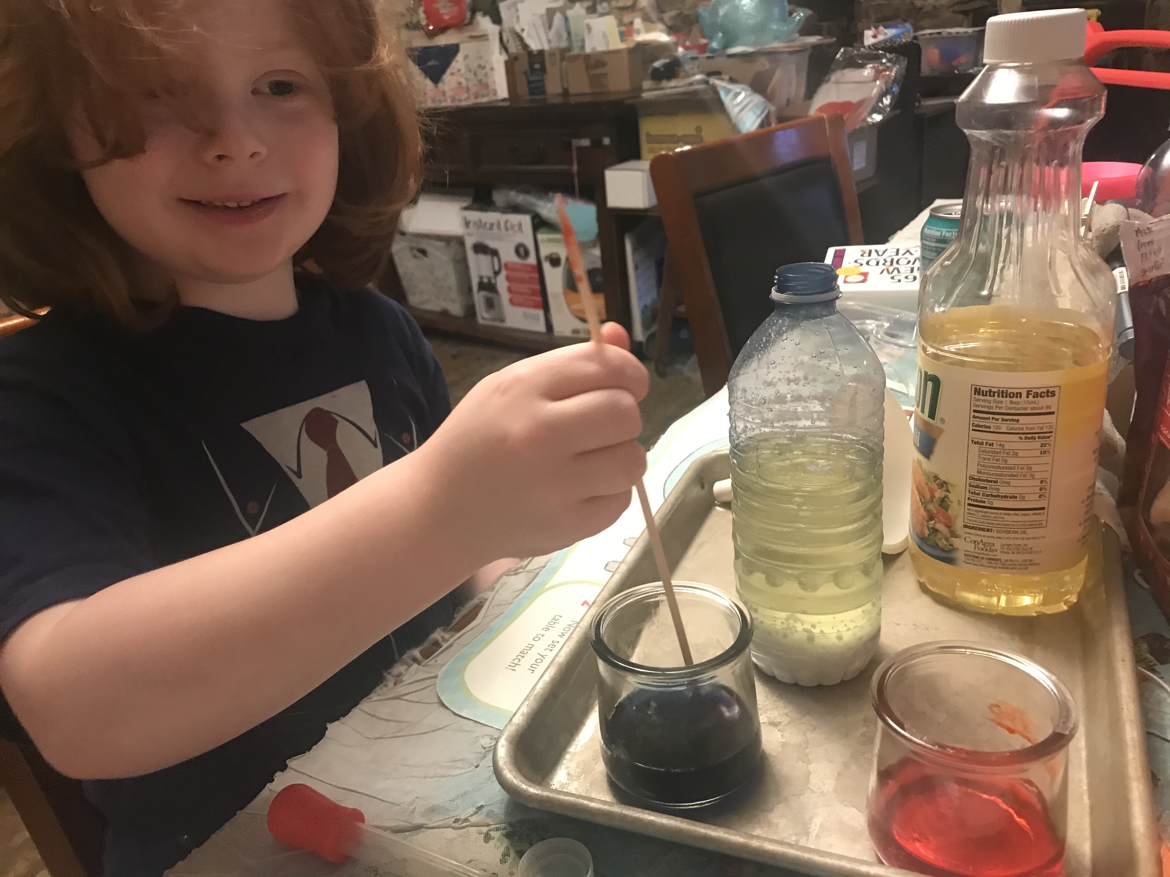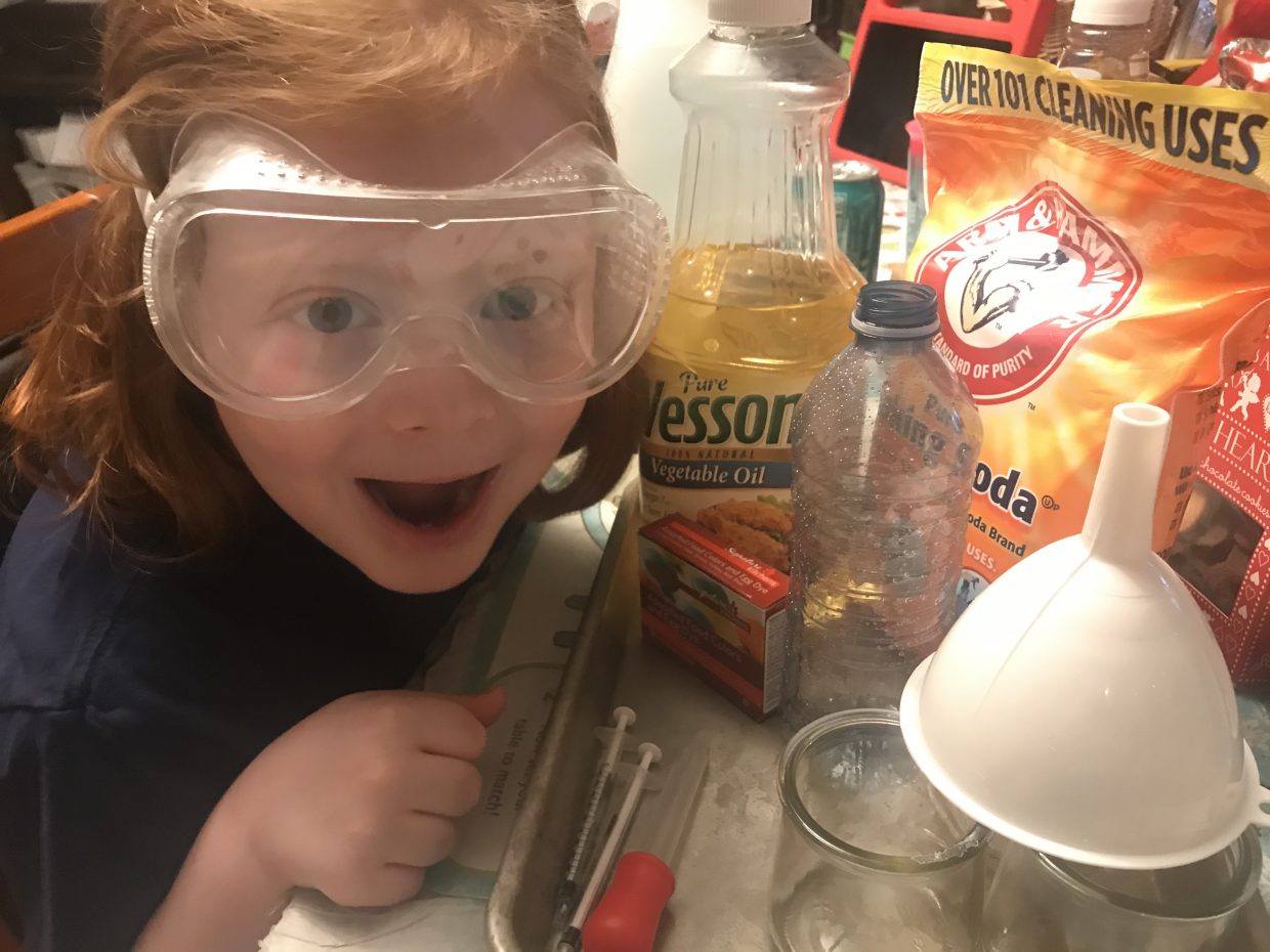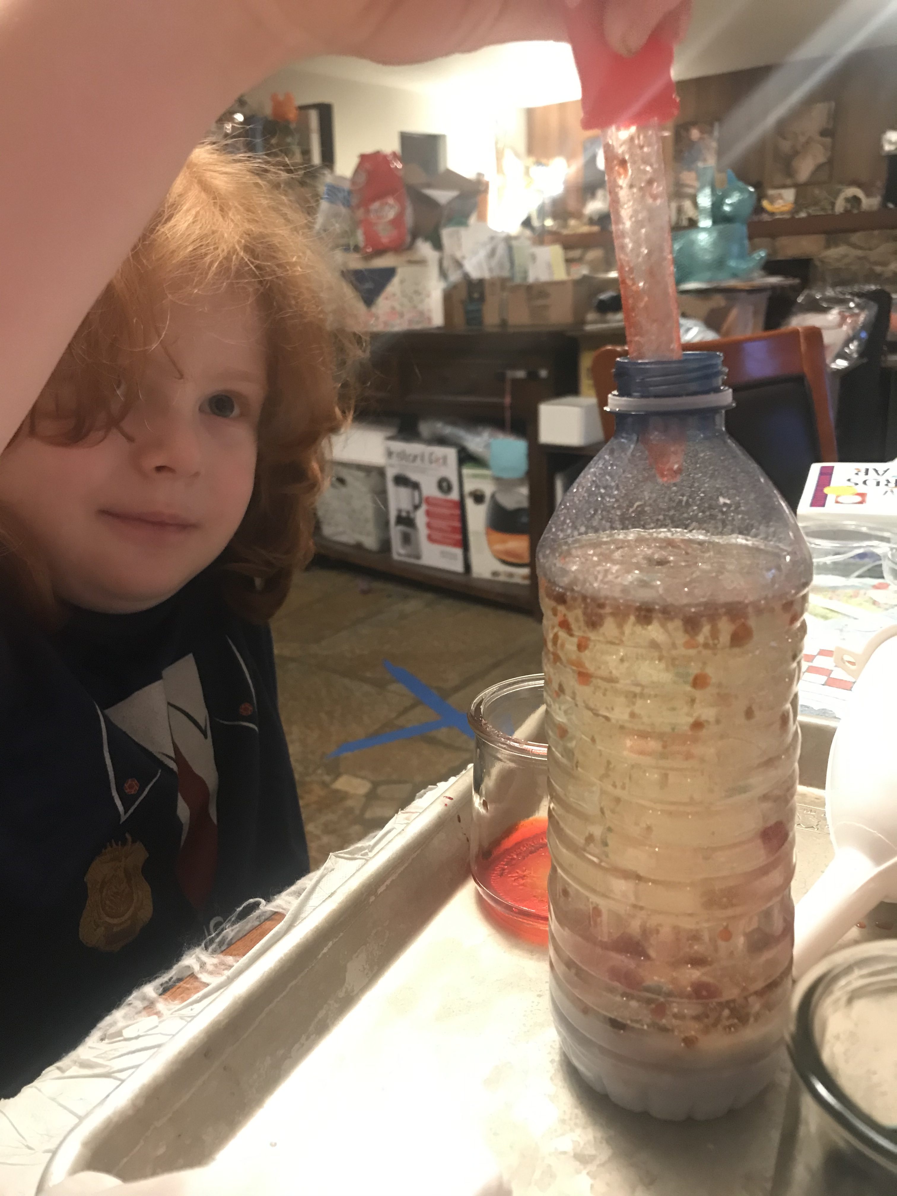 Because of the chemical reaction caused by the baking soda and the vinegar, the colored bubbles go up and down!