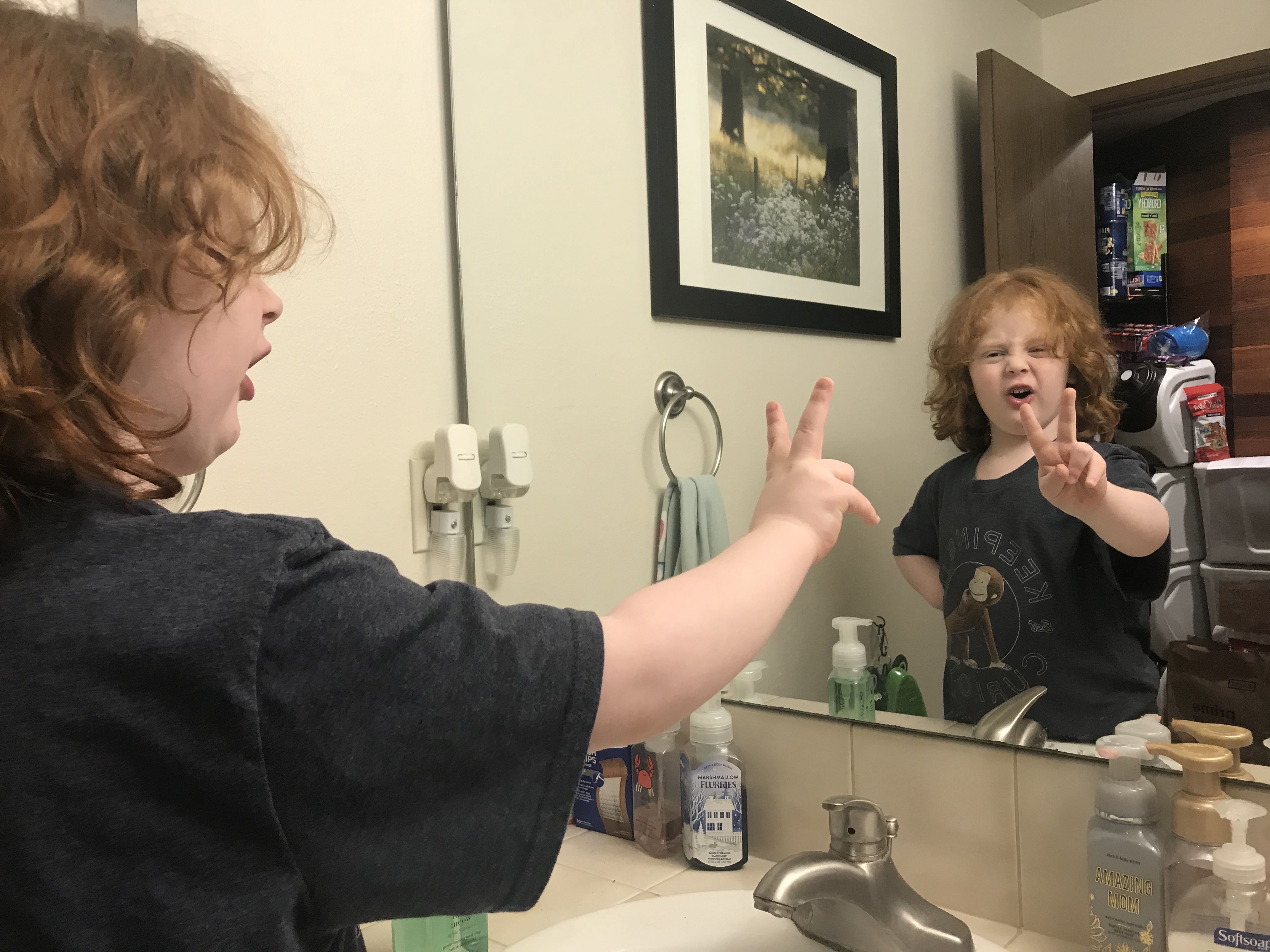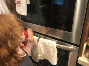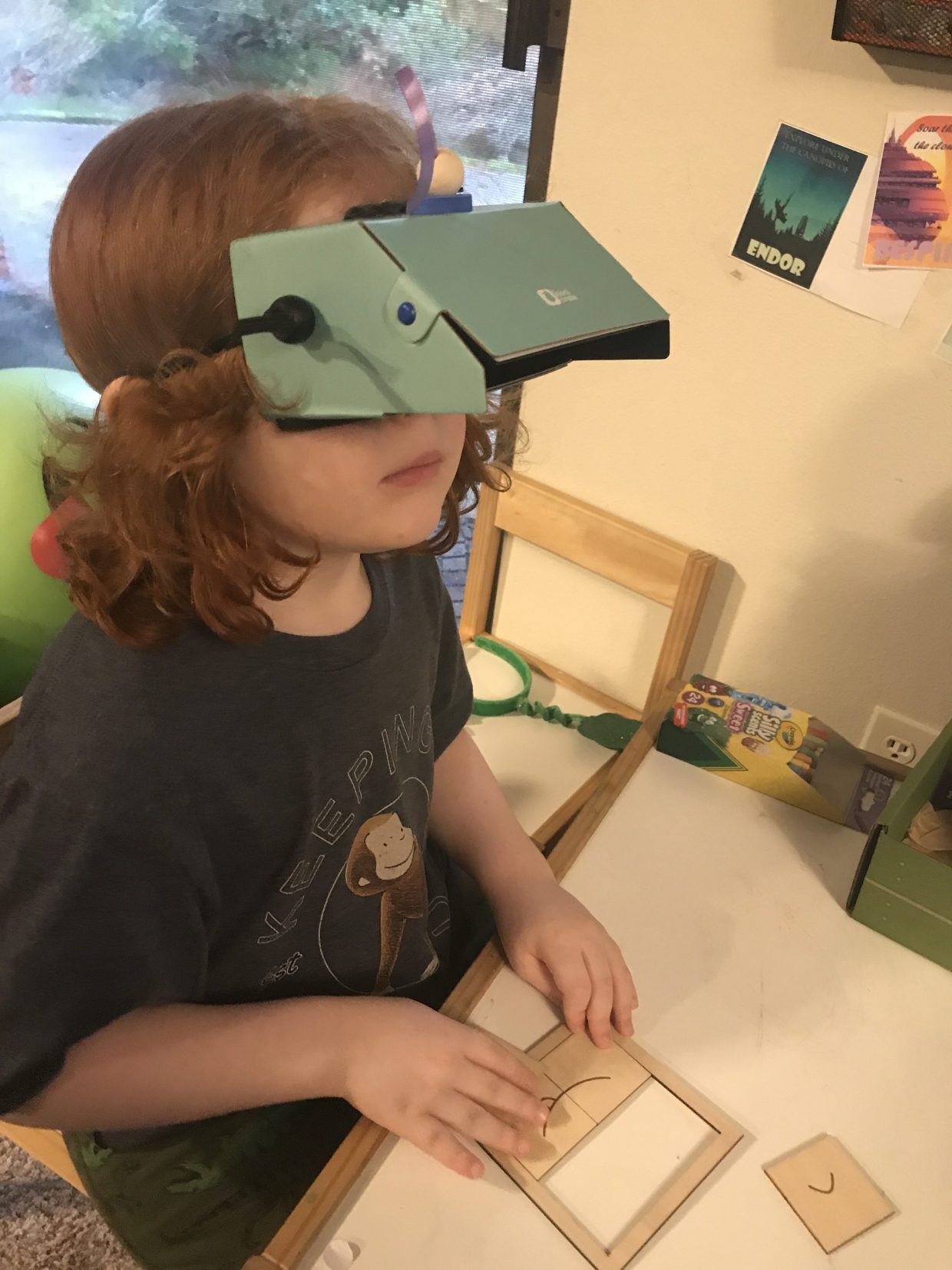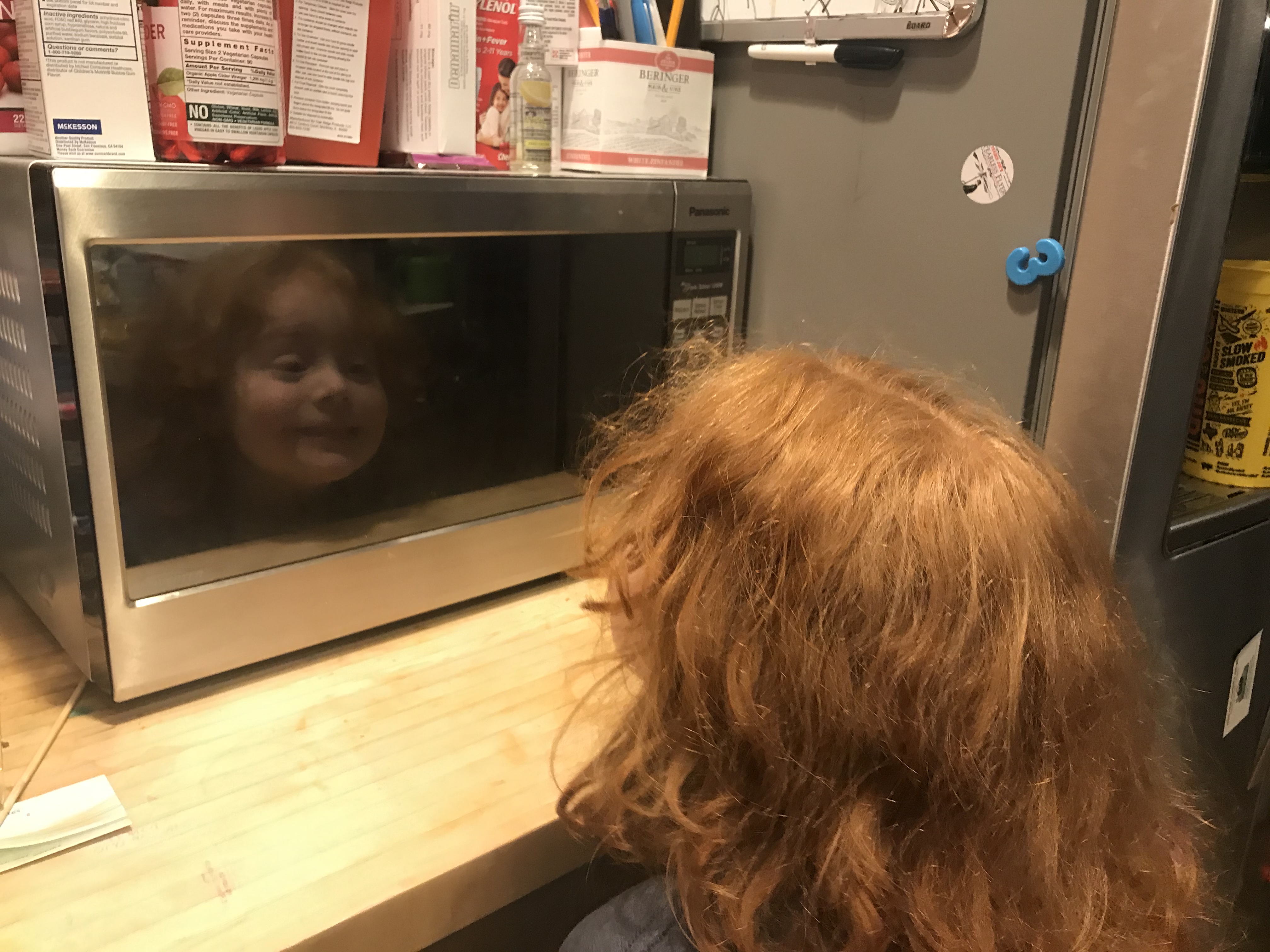 Today in SciFri we talked about light and reflections. I made an illusion box, some mirror goggles (and did a puzzle looking through them), and then we found other places that reflected me, like the oven,