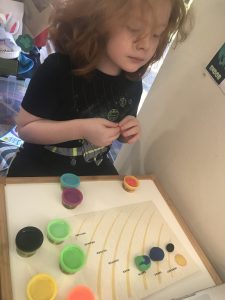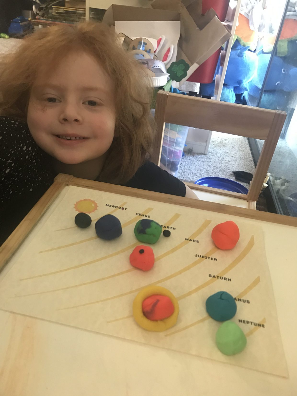 Today in Outschool with Teacher Lisa we learned about the planets and made a representation of our Solar System out of PlayDoh. I even put a little black spot on Mars to signify the Mars Rover!