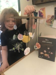 Then Mom cracked open a Kiwi Crate and we made a Solar System mobile! Not our Solar System tho, but one we made up on our own, with aliens and everything!