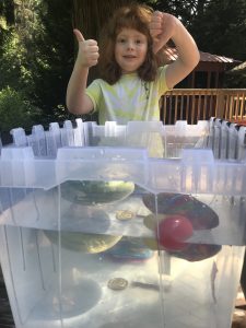 We also did some “will it float or sink” outside in the sunshine. Did you know that an orange in its peel will float, but unpeeled it sinks? So neat!
