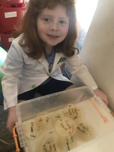 All of the samples had some bacteria growing in them, except, of course, the Control. There were a couple that even had more than one color bacteria growing in their dishes! How cool is that? Maybe not too cool since one of those was from my hands! And I swear I’ve been washing them! A lot! And we’re not sure if Kalika really has more germs in her mouth than Kahi does or if she just had more spit when Mom swabbed them.