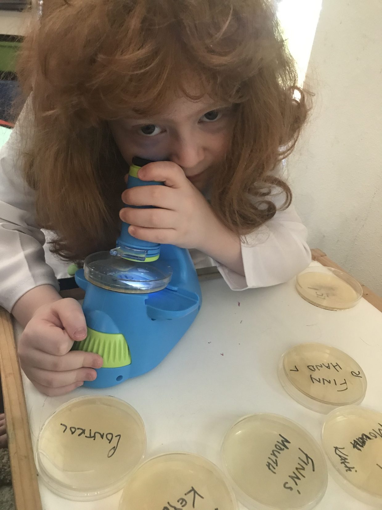 All of the samples had some bacteria growing in them, except, of course, the Control. There were a couple that even had more than one color bacteria growing in their dishes! How cool is that? Maybe not too cool since one of those was from my hands! And I swear I’ve been washing them! A lot! And we’re not sure if Kalika really has more germs in her mouth than Kahi does or if she just had more spit when Mom swabbed them.