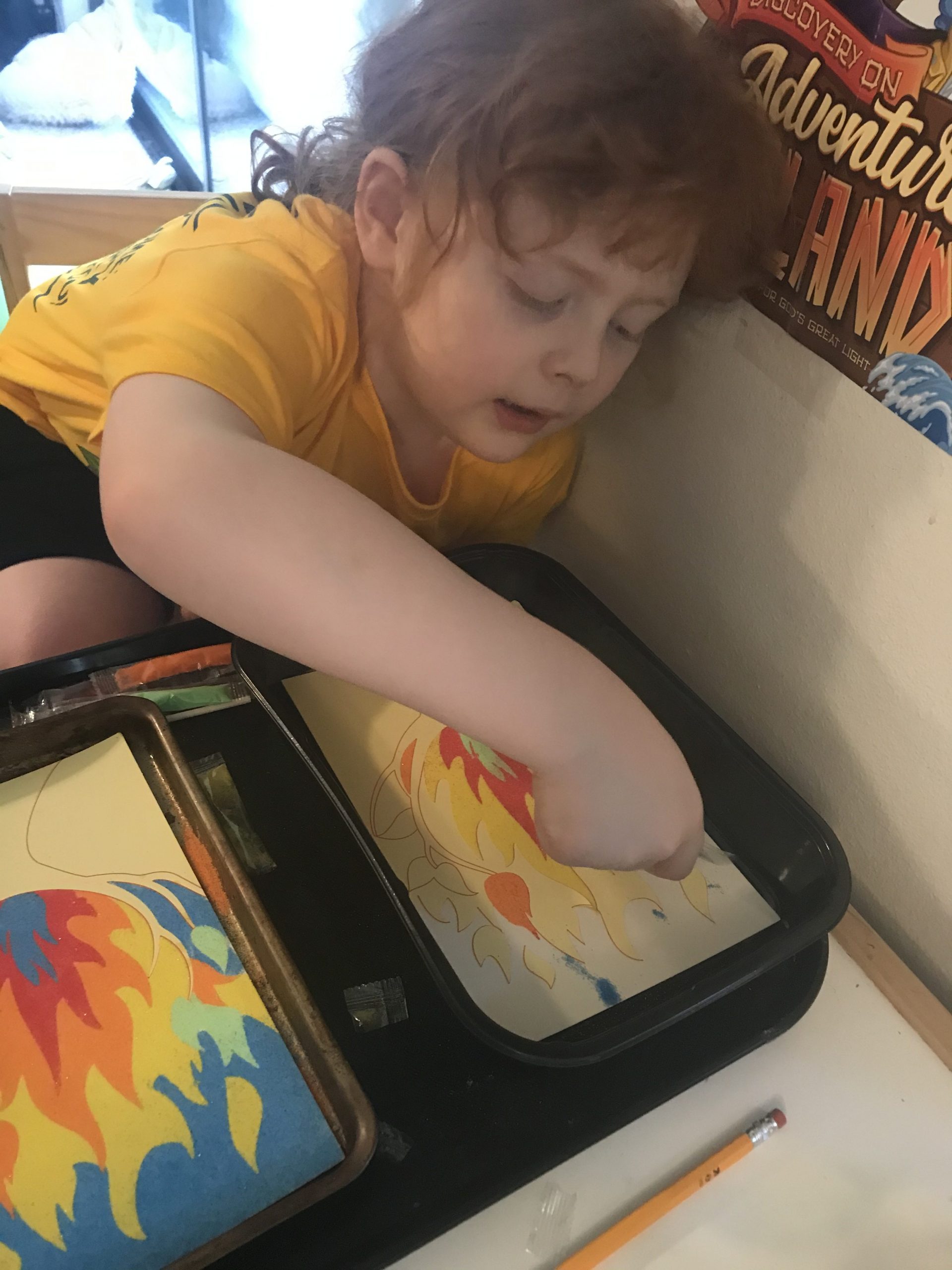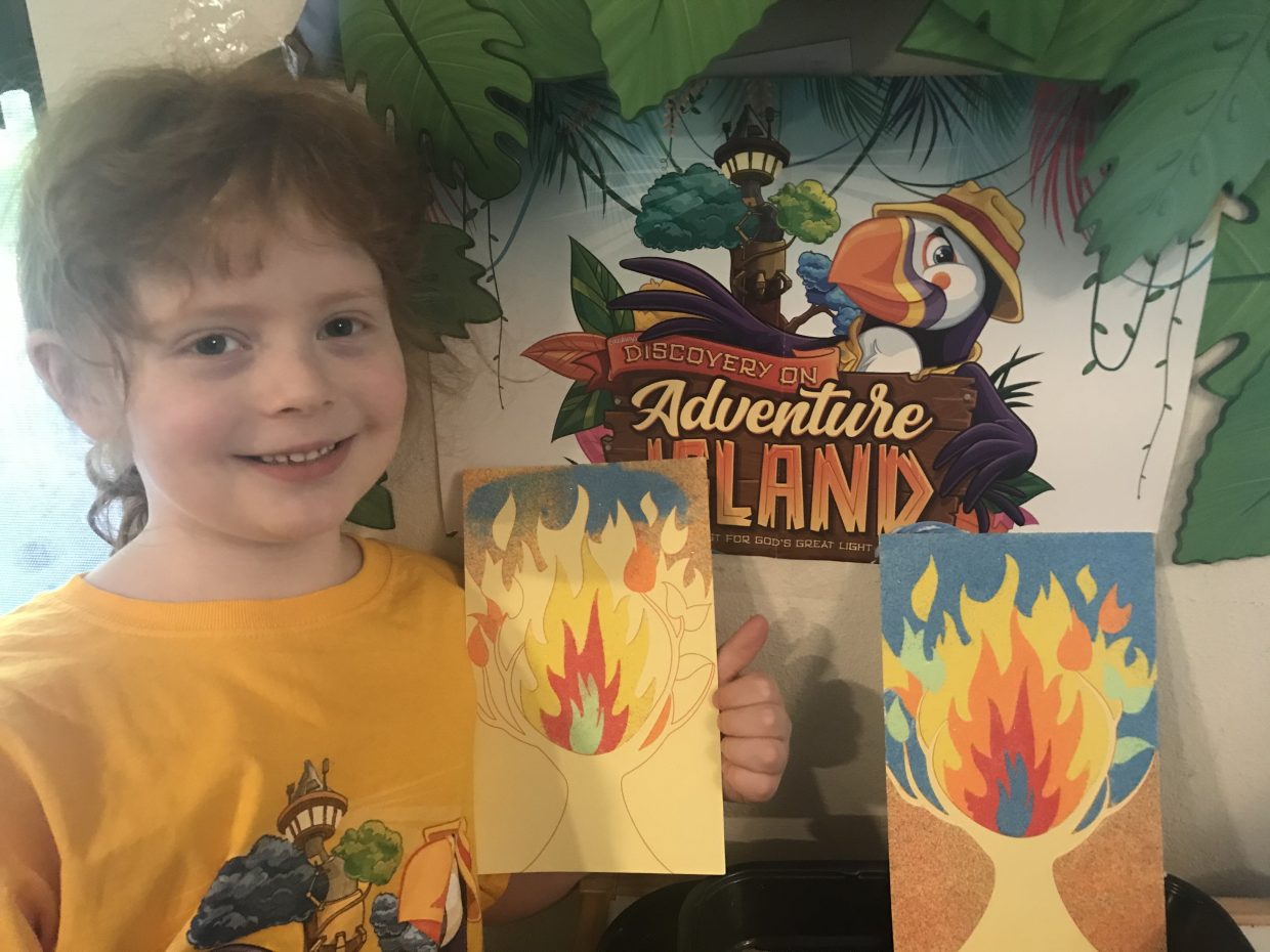 We made Burning Bush sand art for craft time and a lighthouse made out of an ice cream cone and marshmallows for snack time.
