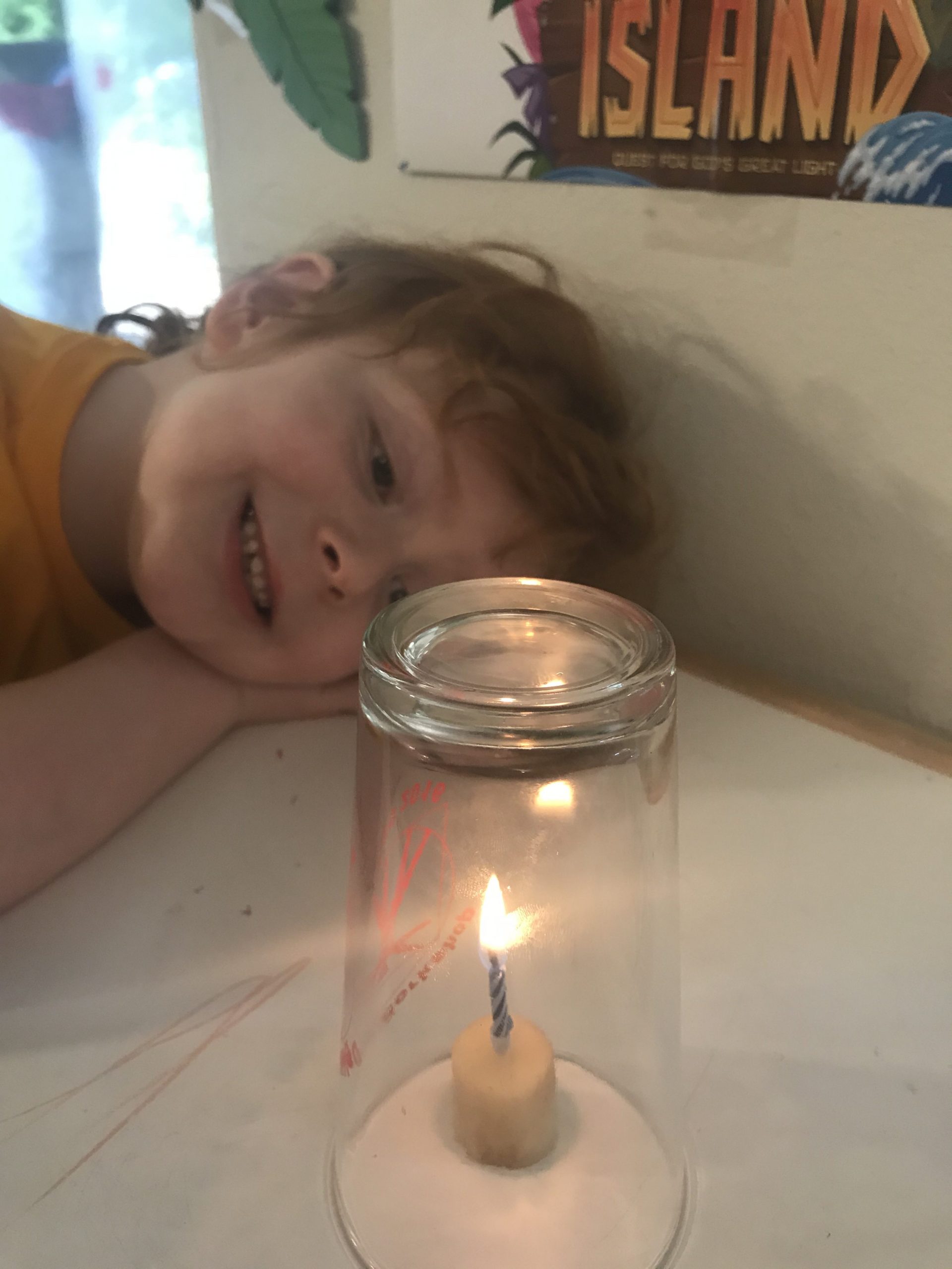 It was really neat to see what happened when you put them under a glass and cut off the oxygen. They all went out then! So much easier than blowing super hard! Especially for the magic candle!