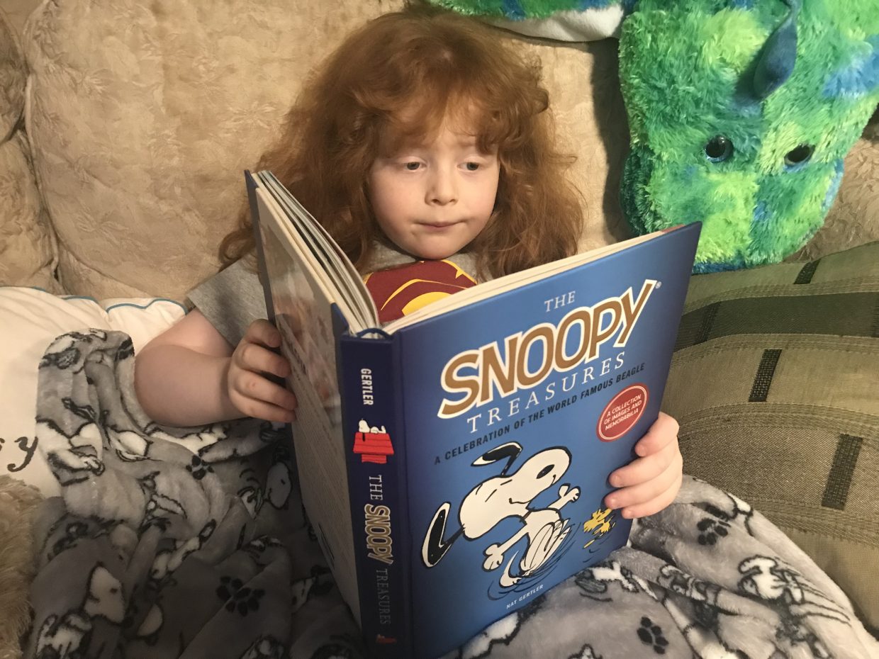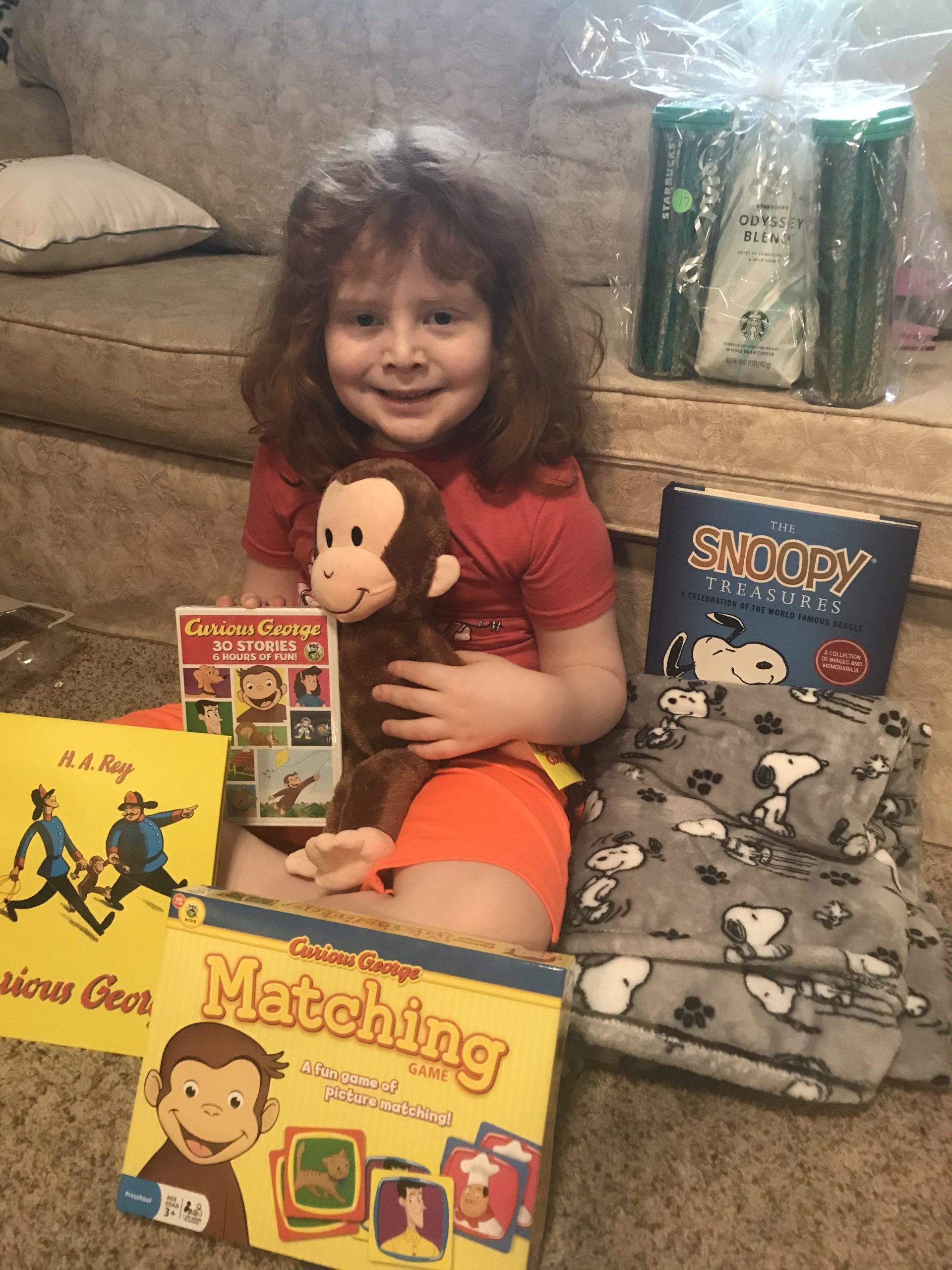 Mom won this Snoopy book and blanket and a bunch of Curious George things at the MEOW Cat Rescue auction last month. Plus she answered a trivia question correctly and won the coffee and cups too!