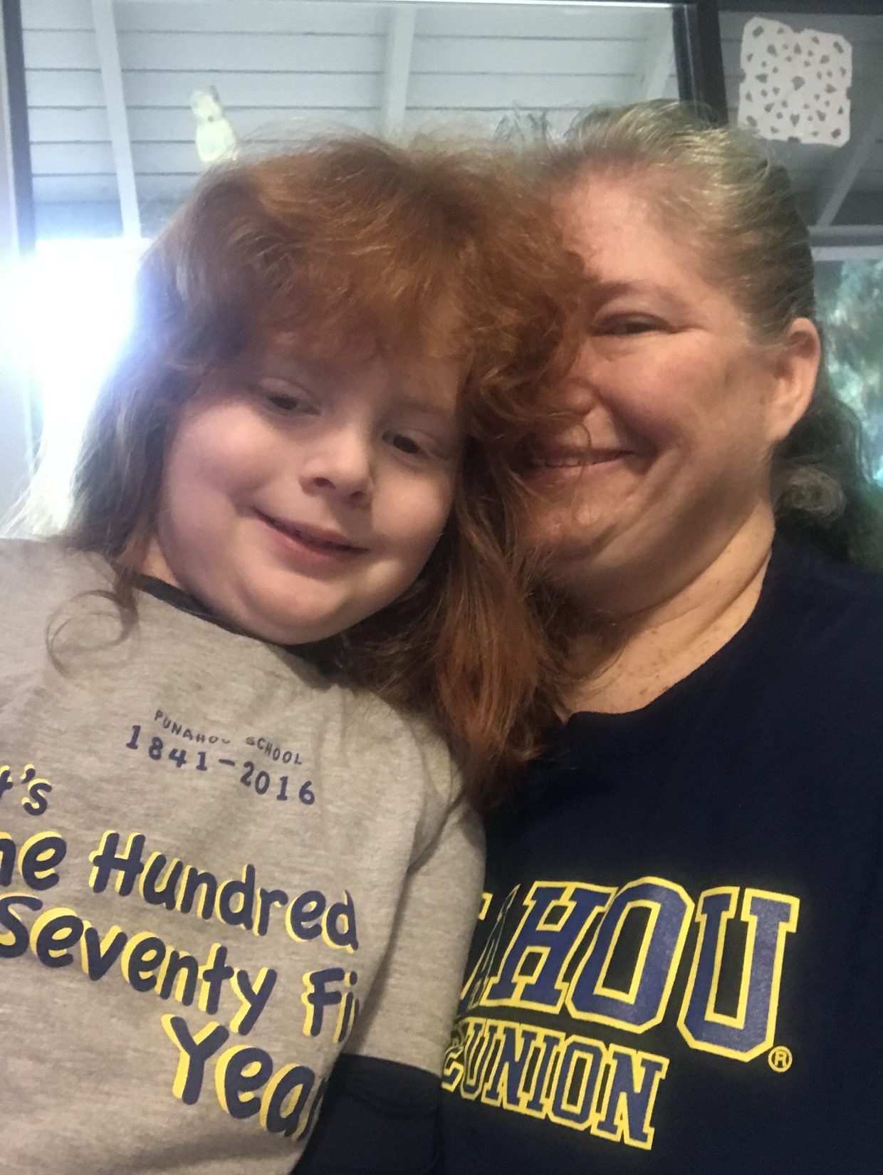 Mom and I dressed in Punahou clothes and found a lot of Buff’n’Blue stuff around the house!