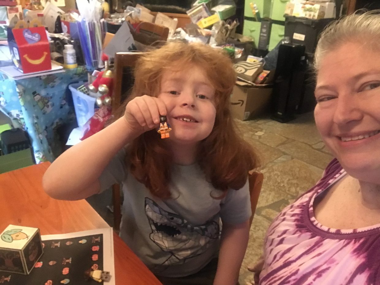 Roll the large die and move around the board. I beat Mom! LEGO guys always make good player pieces!