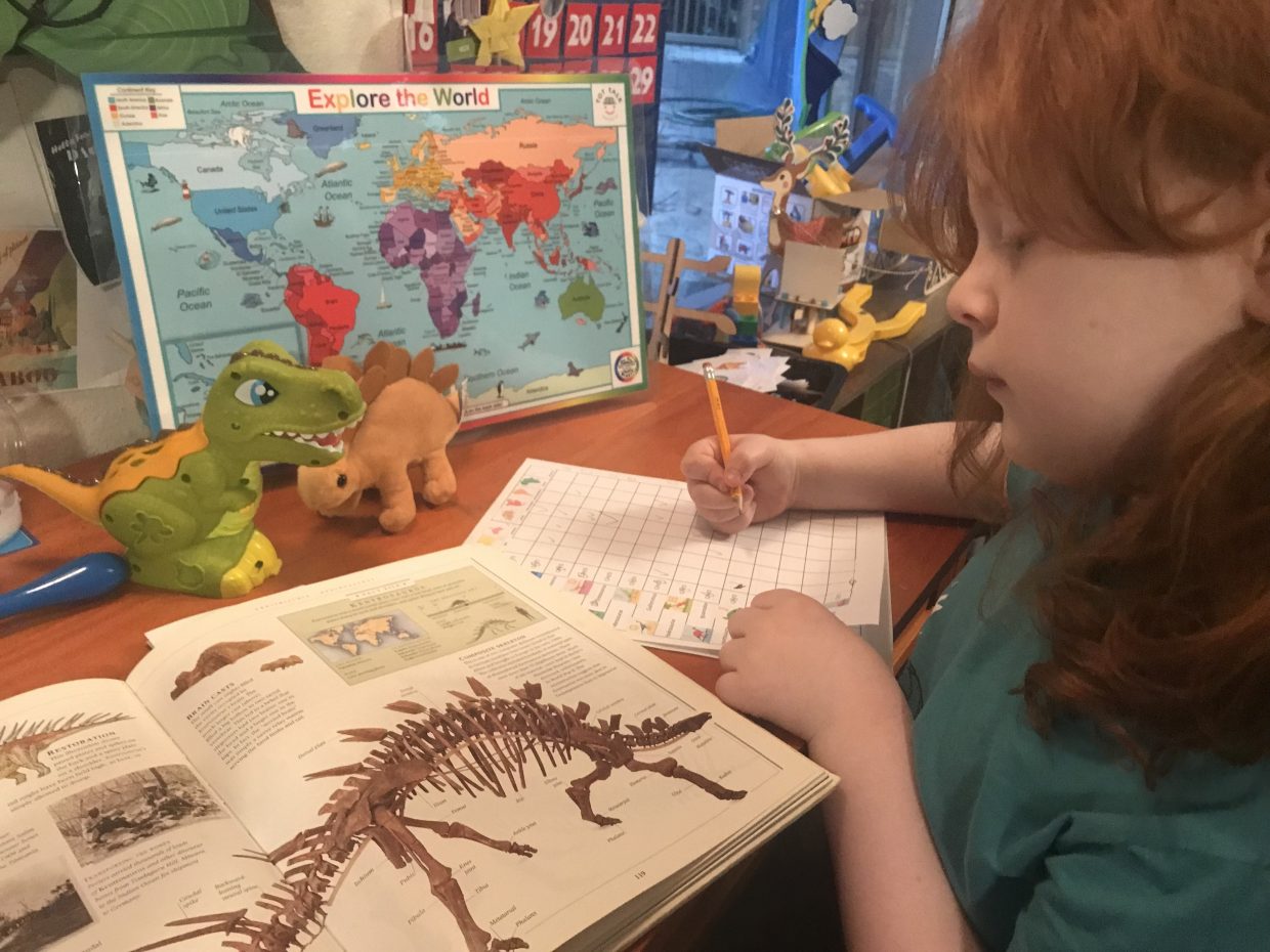 Mom is teaching me how to look up each name in the index and then get the answers by turning to the correct page. (Thanks again for the Dinosaur book, Auntie Deb! It’s super helpful!)