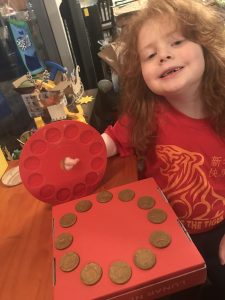 Then I got to make these neat good luck coins with each of the animals of the Chinese zodiac on them. We used clay and pressed it into a mold, then baked them until they were hard.