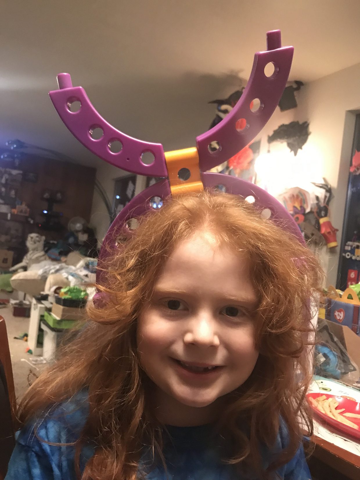 It stays on Mom’s head best, with her pony tail, and not at all on D-Dad’s head. But I think it looks best on me!