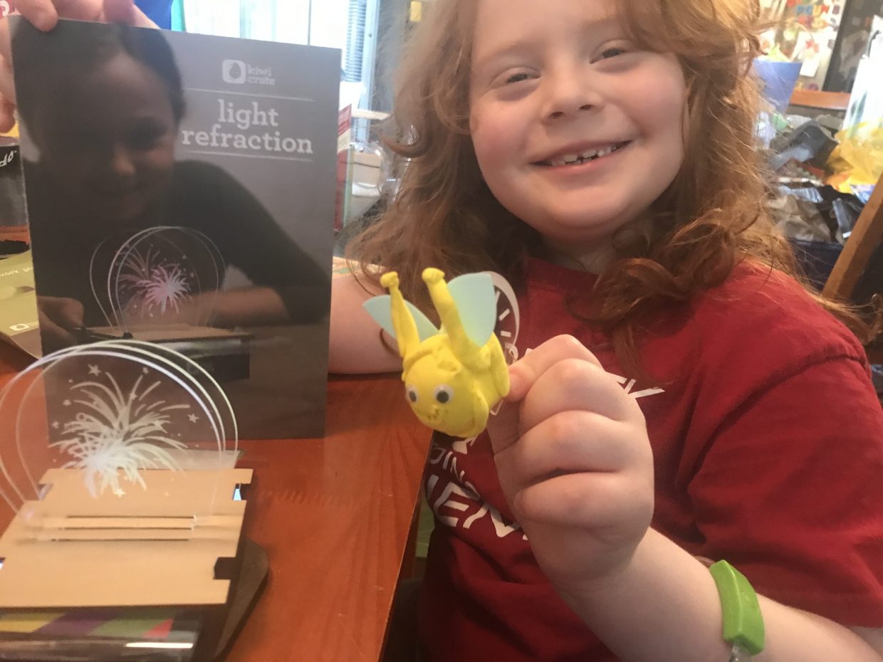 We made a kind of lantern by putting a bottle of water on top of a LED light. Then a cute little firefly that really lit up!