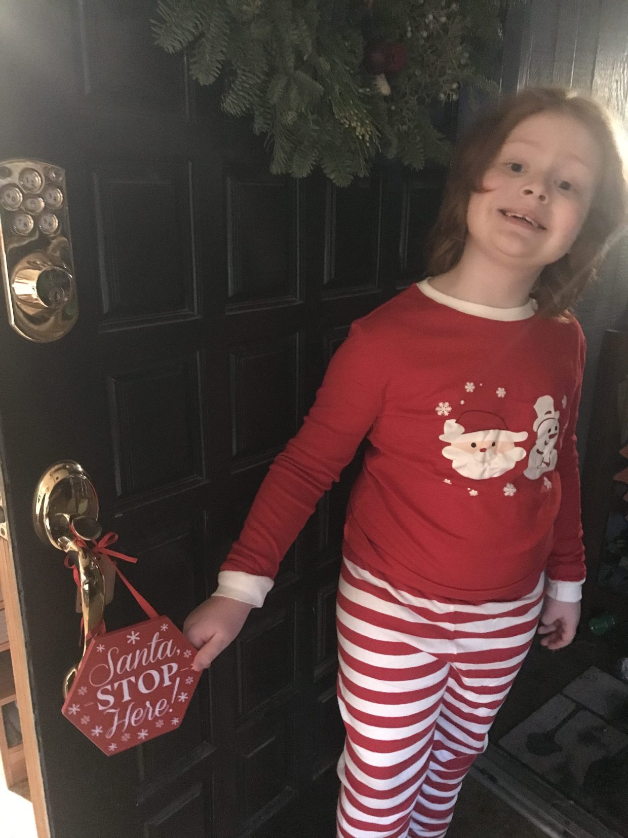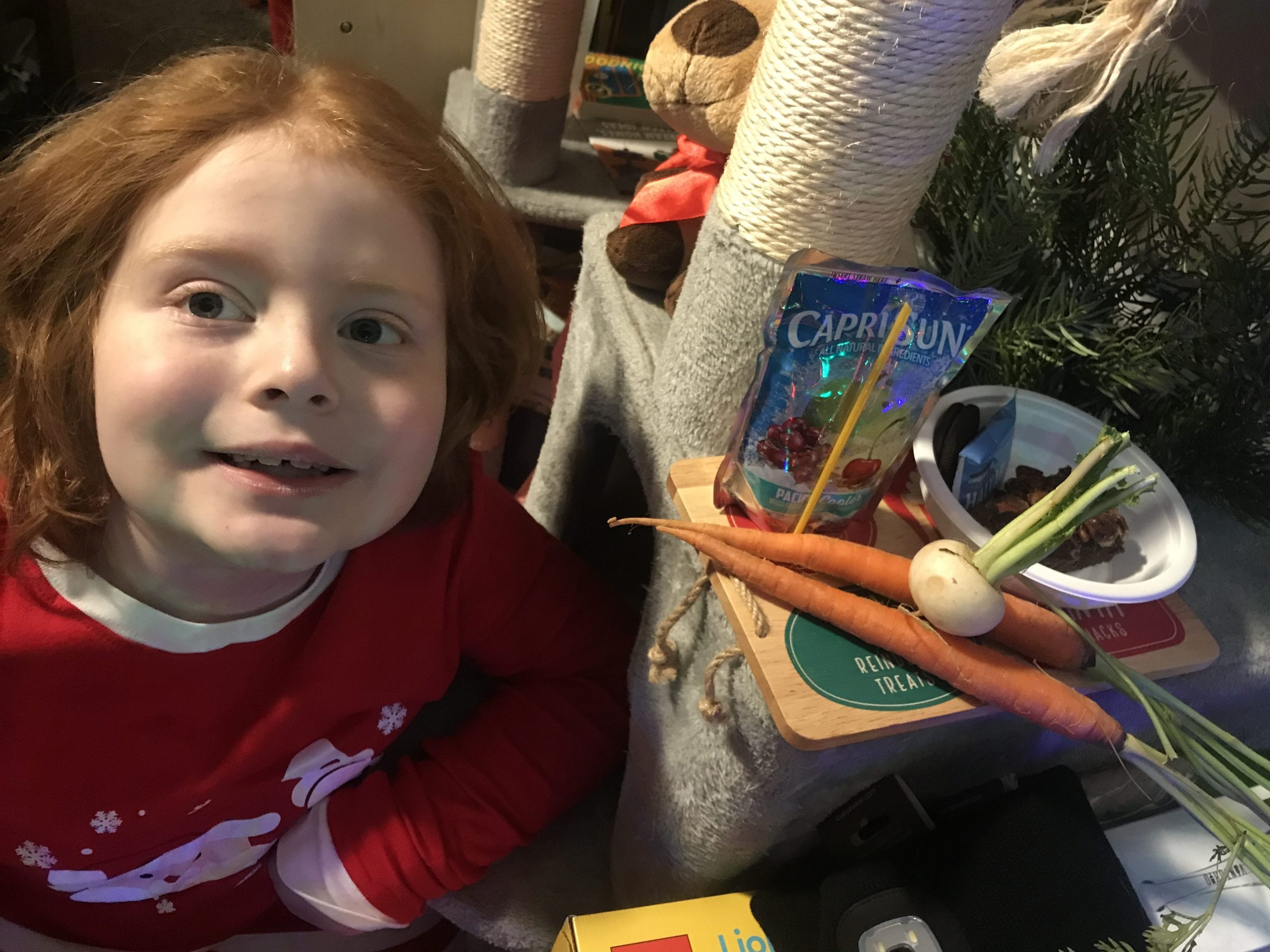 I put out the sign (with the secret magic key in case he can’t get through the fireplace), and there’s reindeer bait sprinkled across the patio… and I left some treats for Santa and the reindeer. We like a variety of snacks – fudge, brownie, Oreo, and some Halvah for Santa, and carrots plus a turnip for the reindeer! Oh, and a Capri-Sun since he’s probably sick of mill by this point!