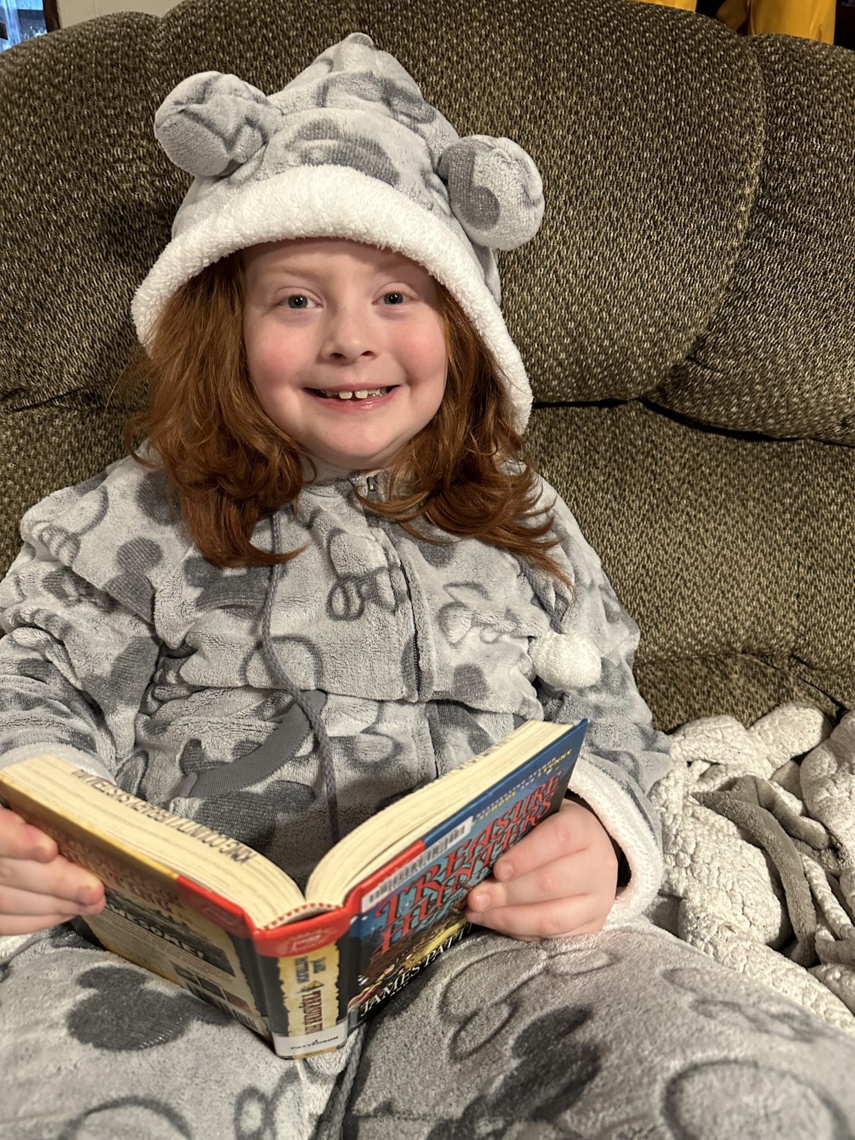 The weather people are saying there is snow in the near future… it sure is cold enough out! I’m glad Mom got me this snuggly warm jammie suit, and that the only adventures I’m going to have today are in this book!