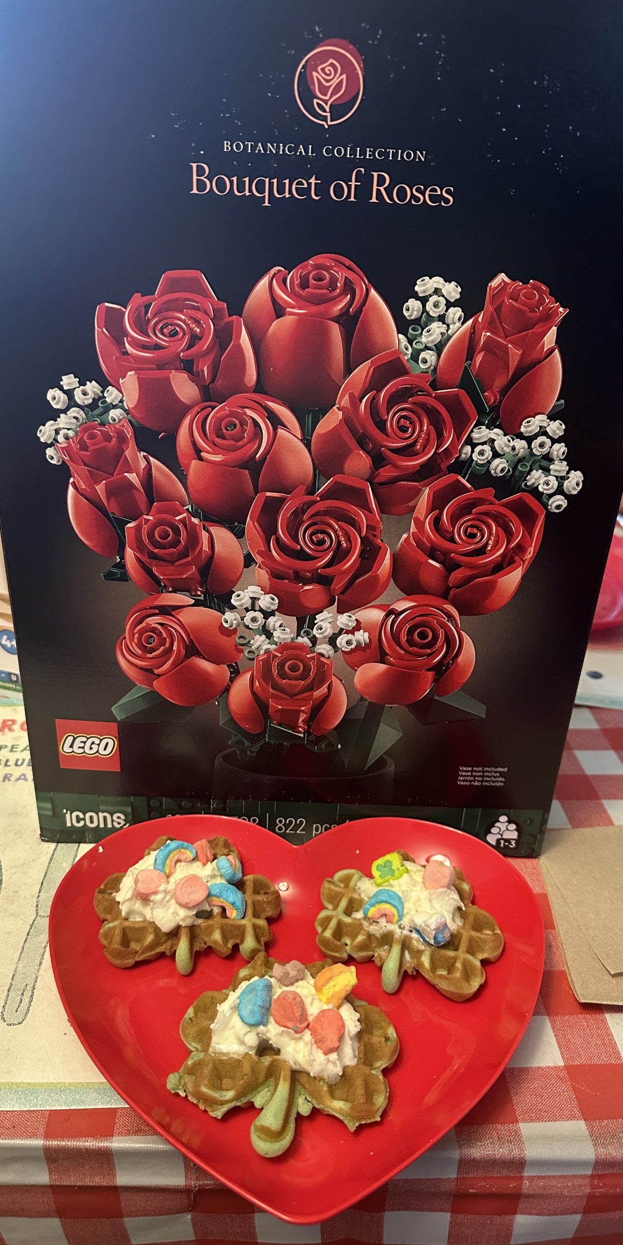 We had green shamrock waffles with Lucky Charm marshmallows for breakfast and D-Dad got Mom some LEGO roses for their anniversary
