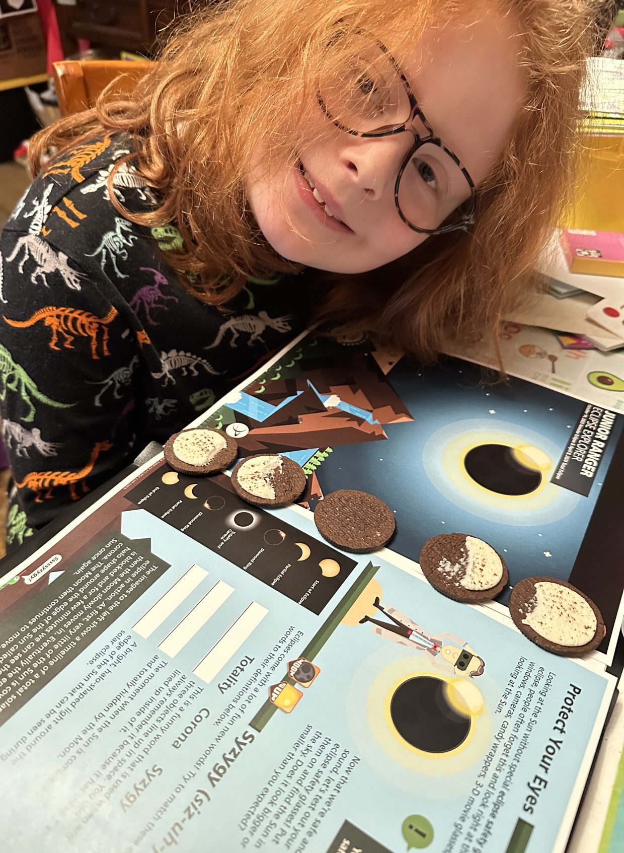 We filled out my Jr Ranger Eclipse Explorer booklet today and demonstrated what it looks like when the moon moves in front of the sun using Oreos!