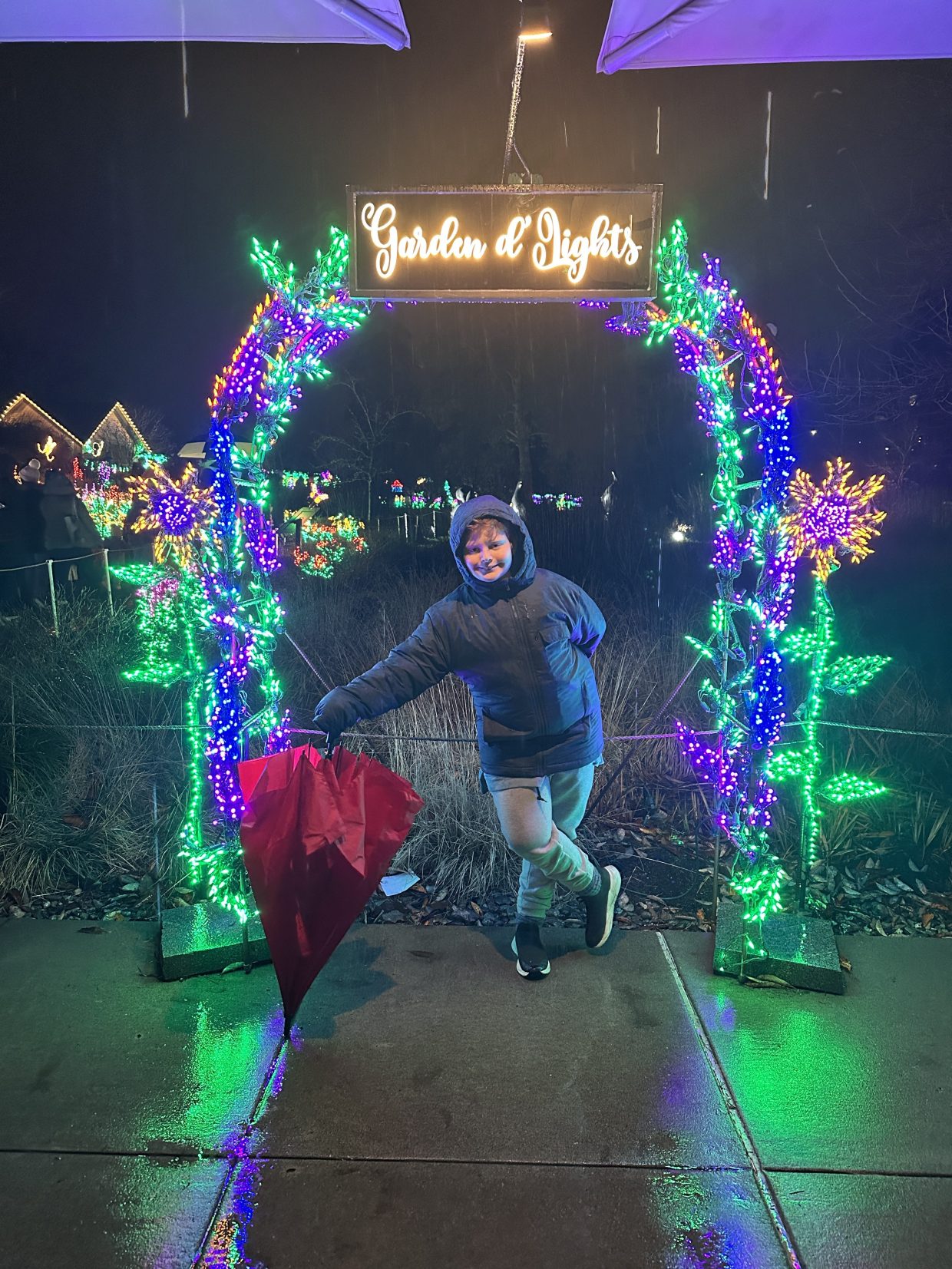 Bellevue Botanical Garden decks their arboretum in lights – all sorts of plants and animals made out of lights, even this dragon! Even the cold (42°) and rain couldn’t keep us from checking it out!
